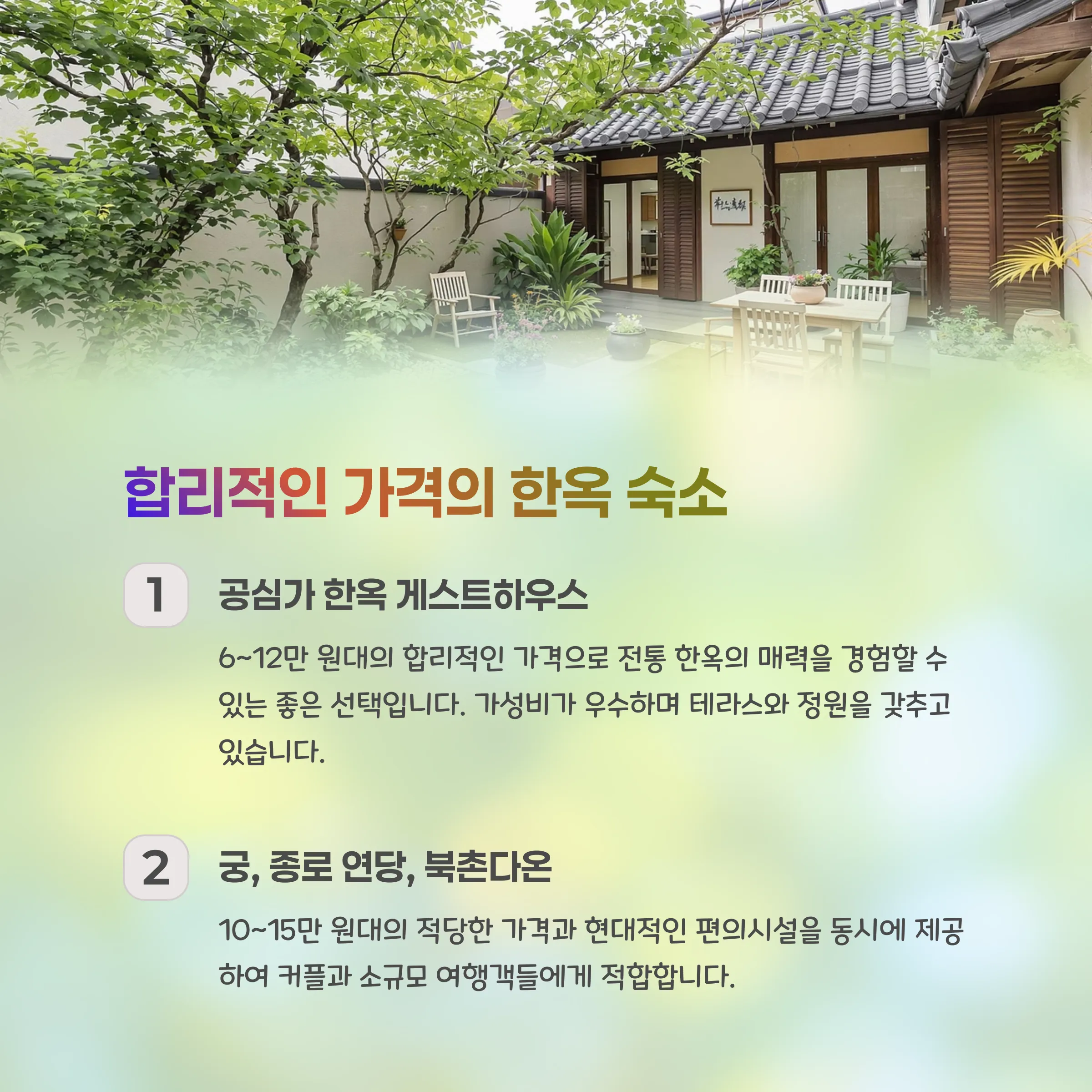 궁, 종로 연당, 북촌다온 한옥 게스트하우스 같은 합리적인 숙소를 추천합니다.