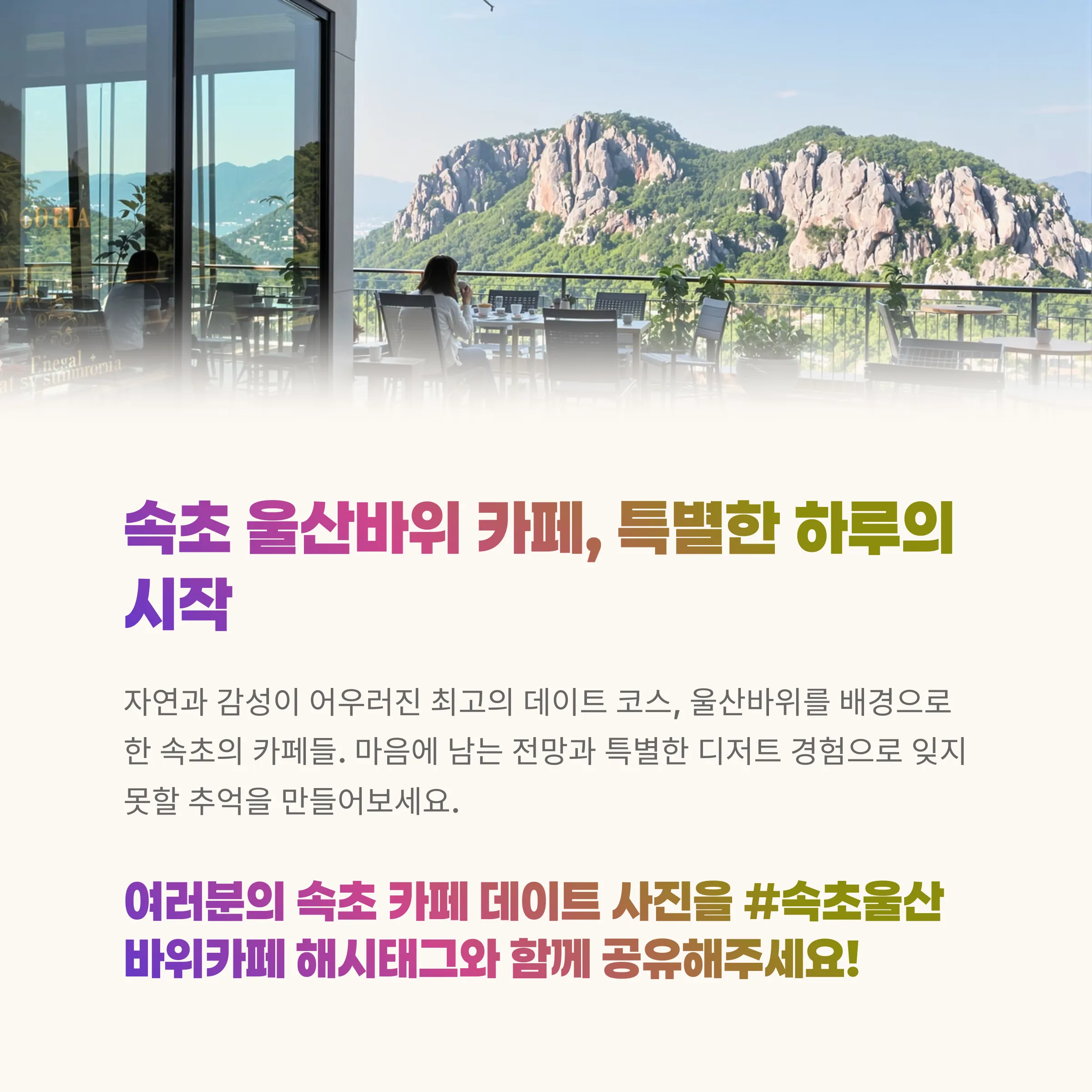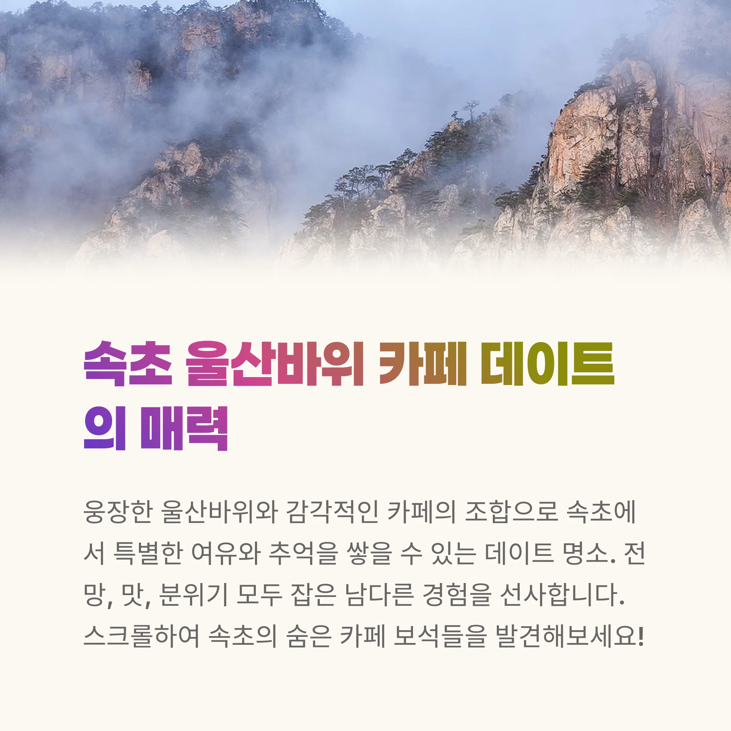 오늘은 울산바위 뷰 카페를 중심으로 속초에서 즐길 수 있는 실내 데이트 코스를 소개합니다.