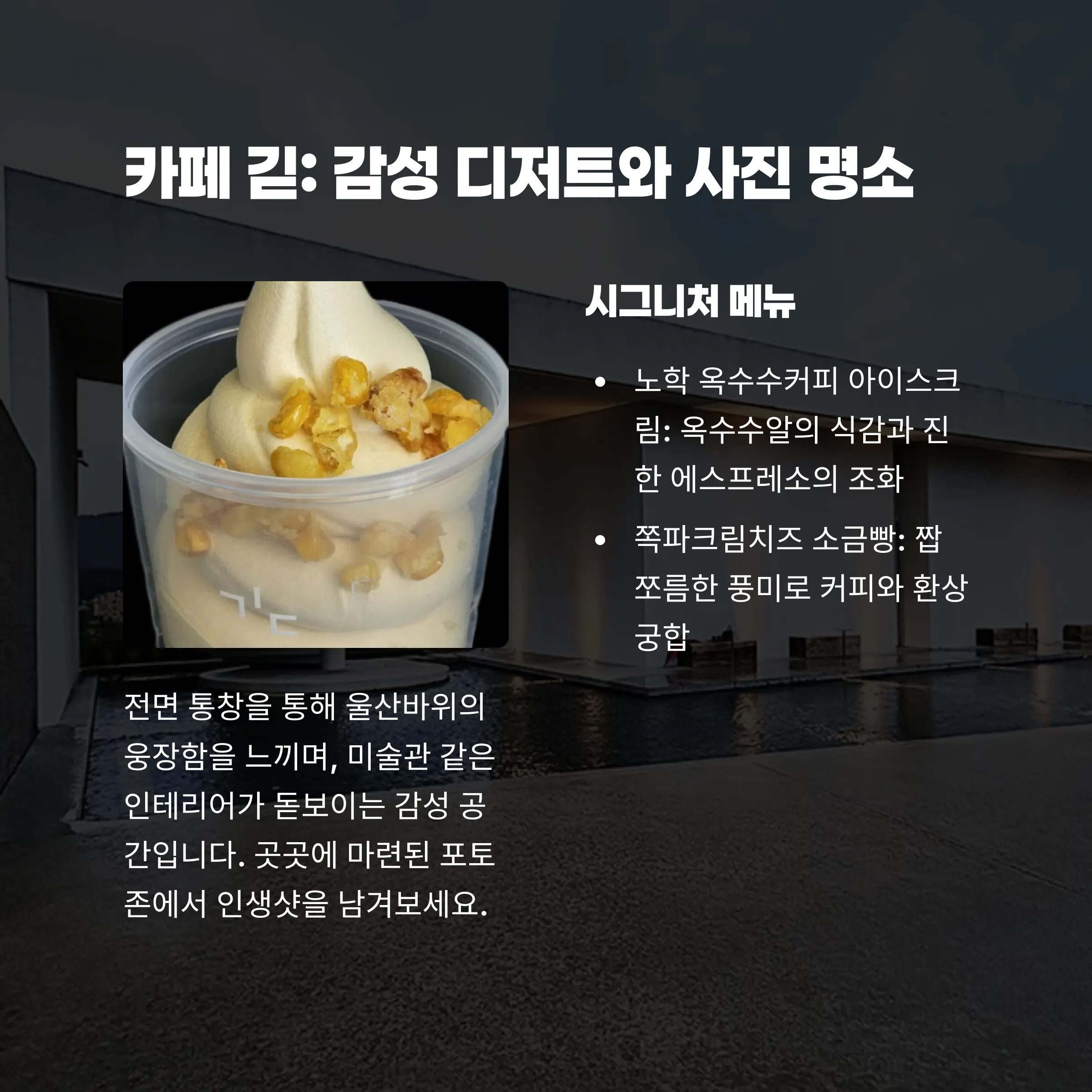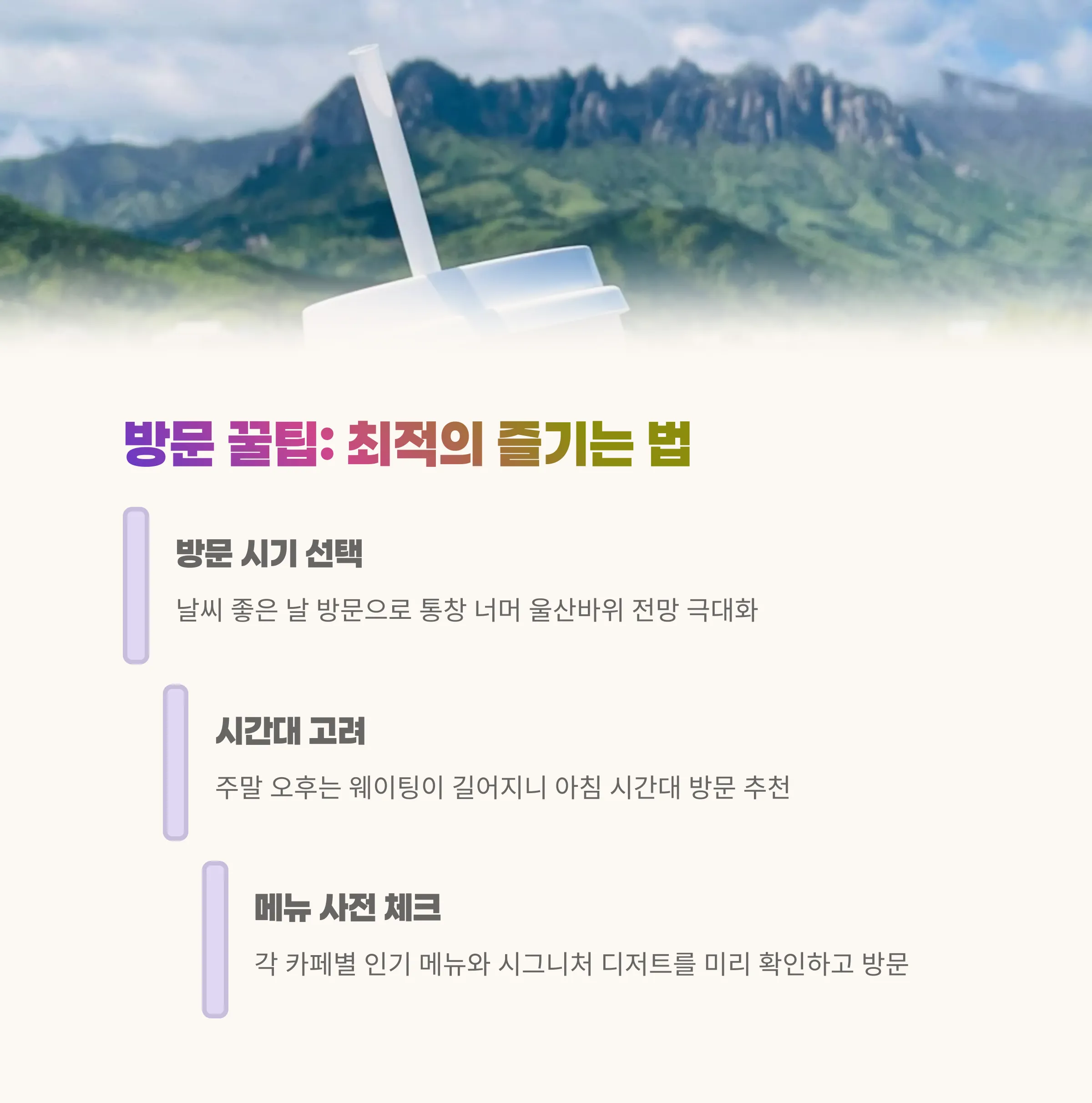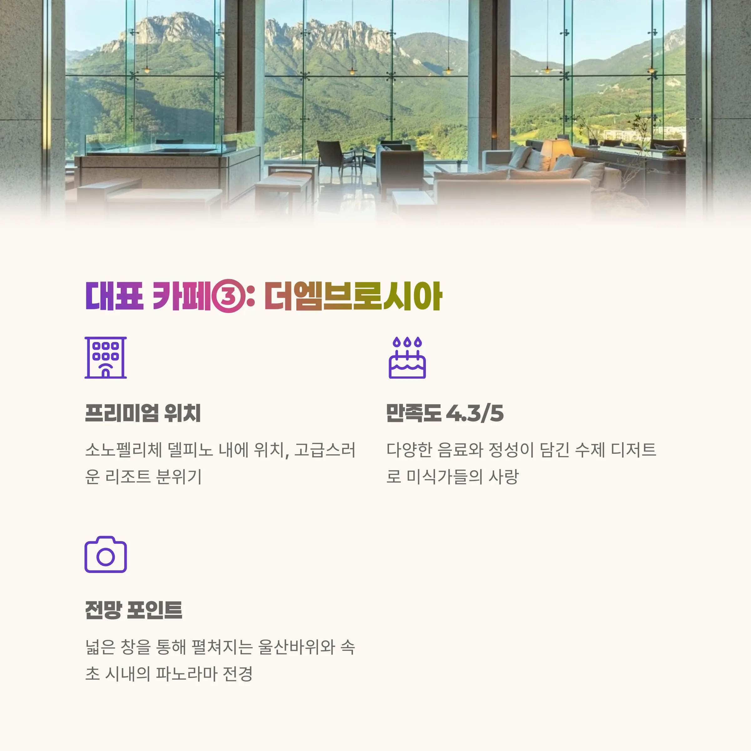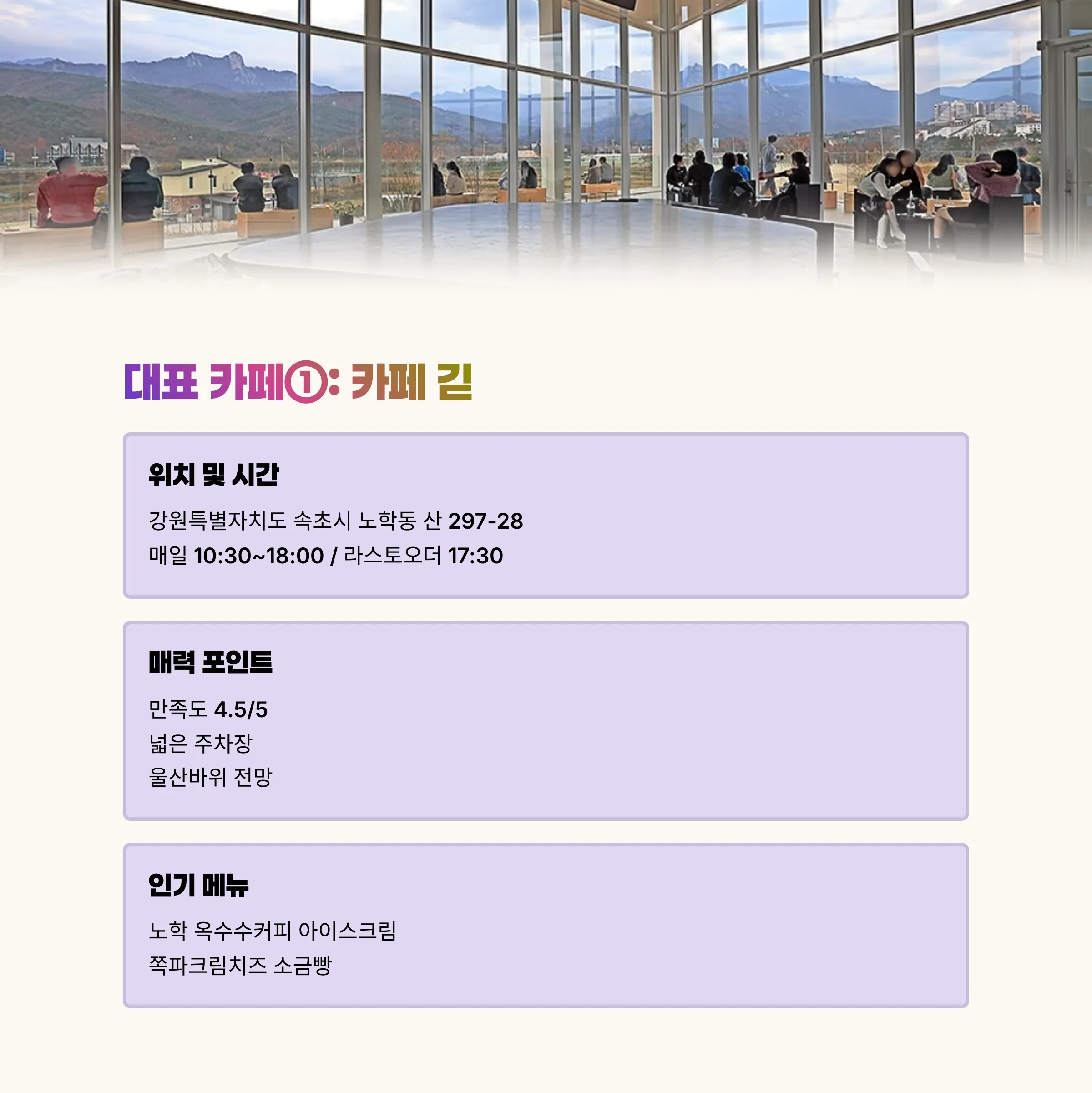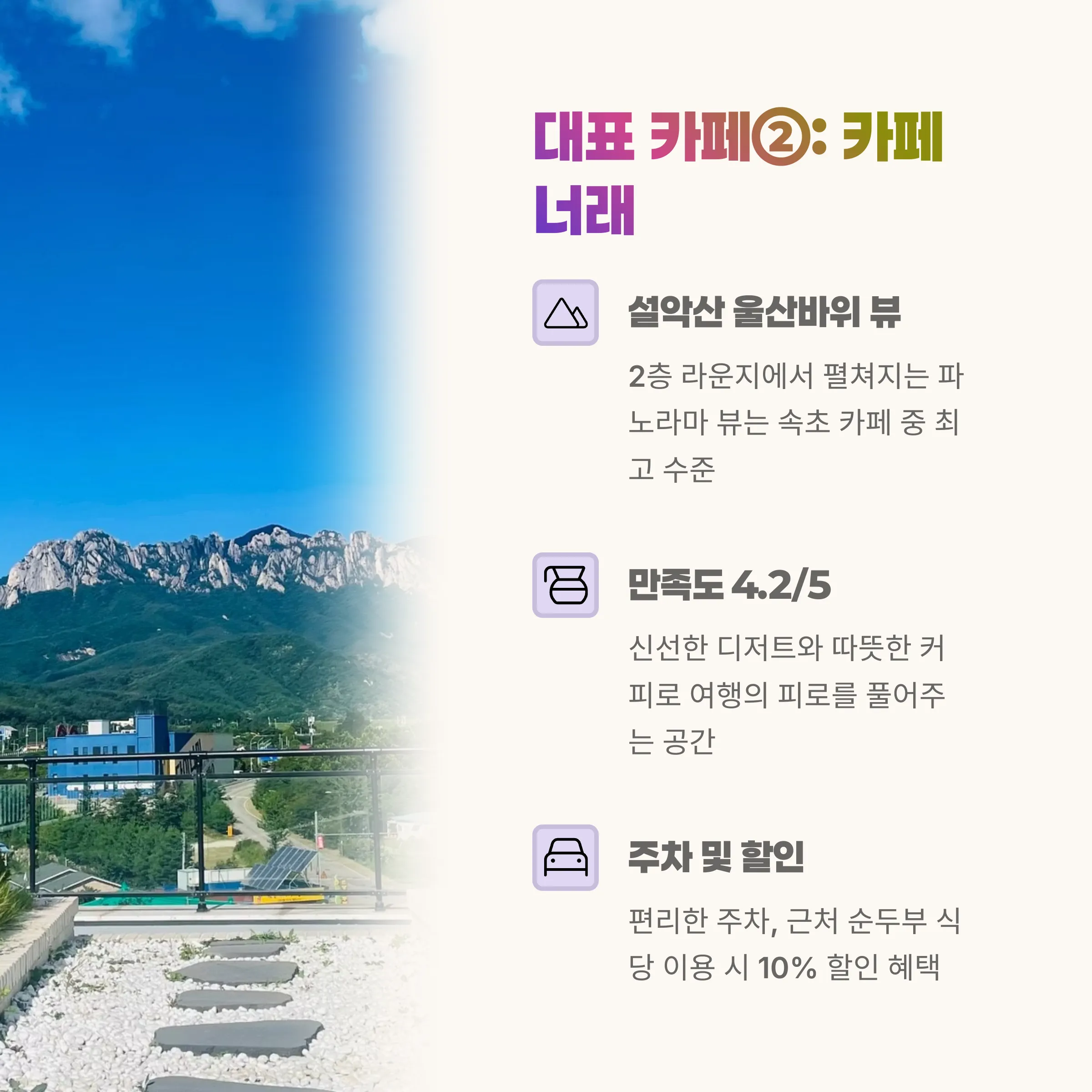| 특징 | 울산바위가 보이는 멋진 뷰, 통창, 다양한 디저트/커피 제공 |