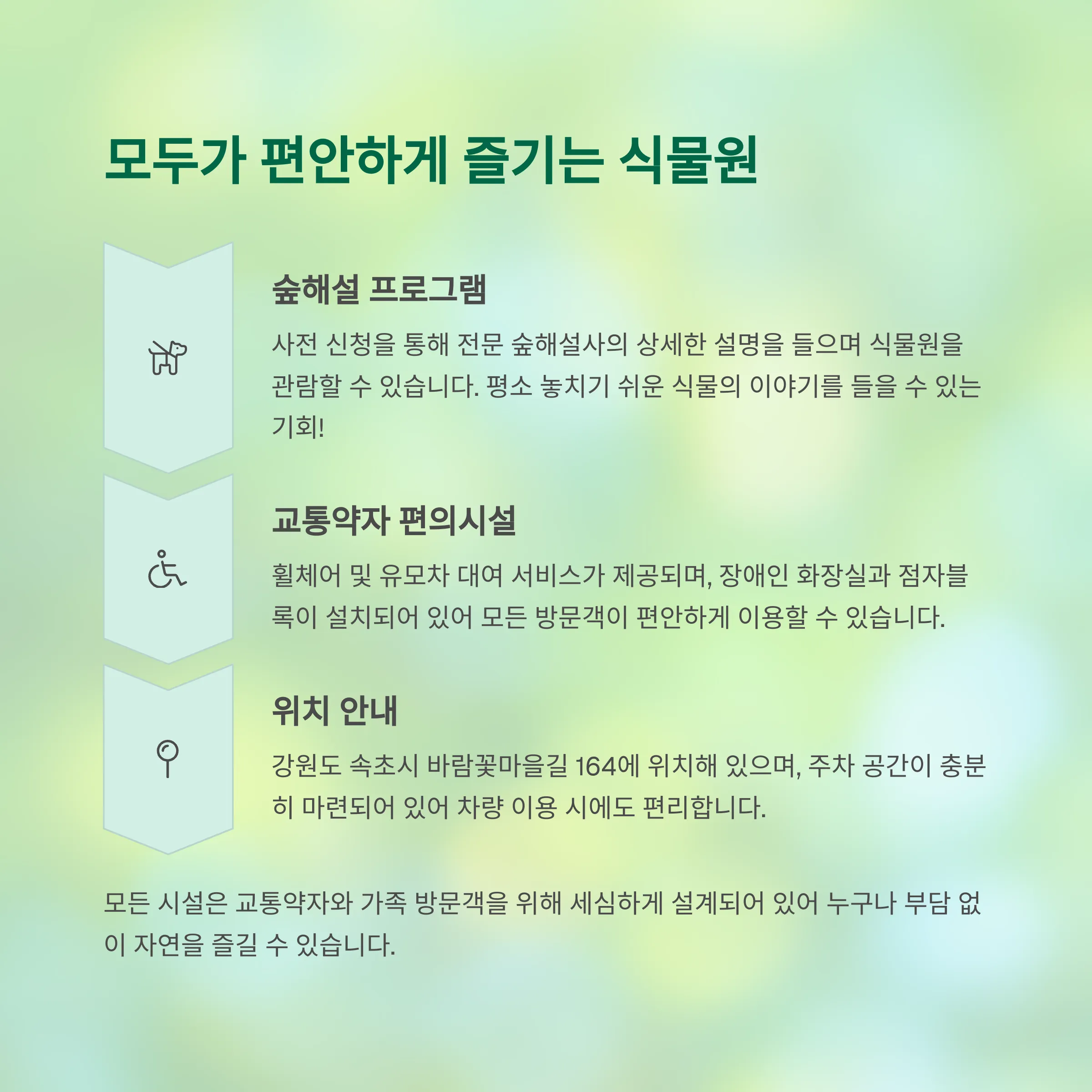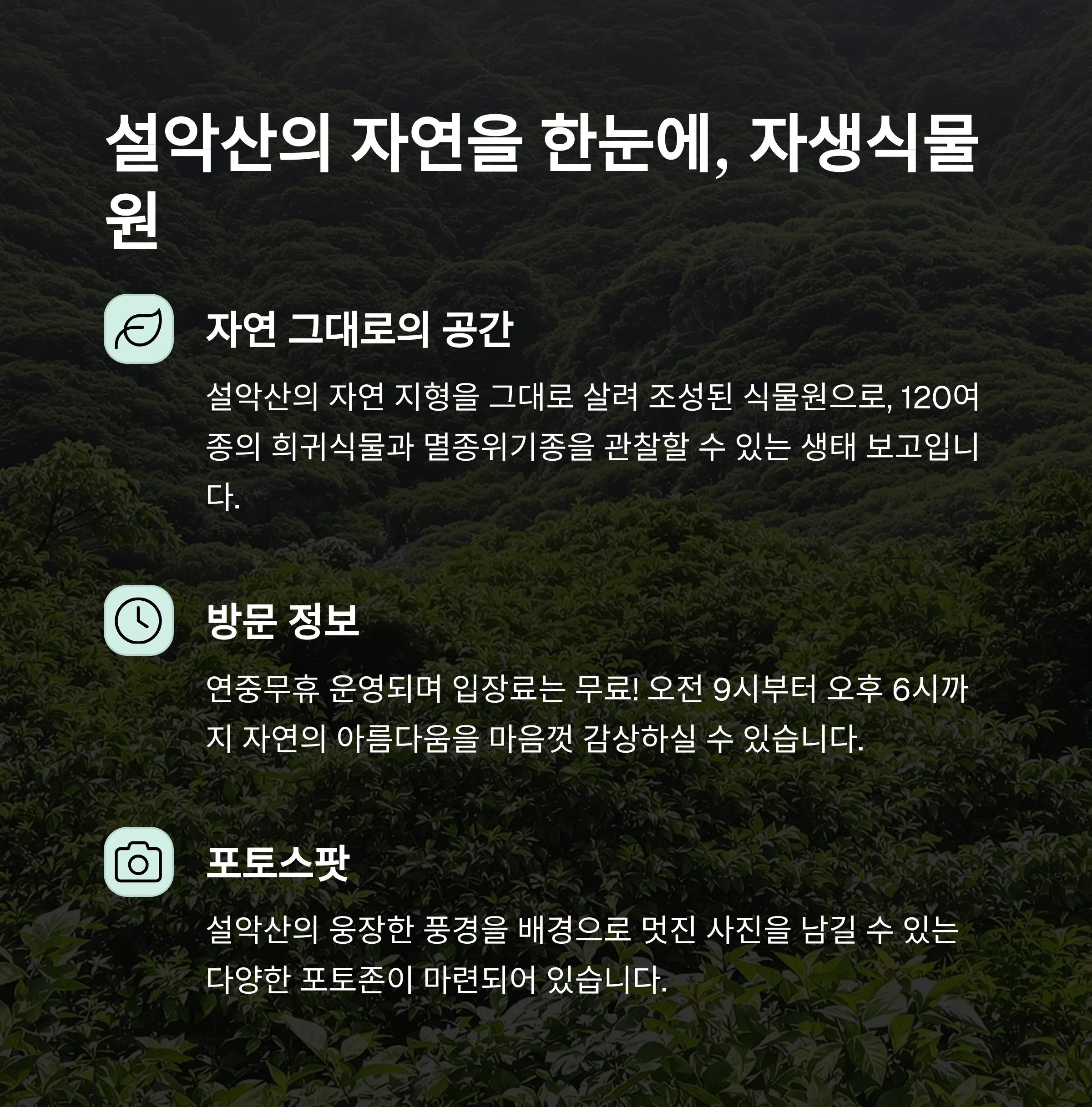- 자연 친화적 설악산자생식물원에서 다양한 생태를 경험하세요.