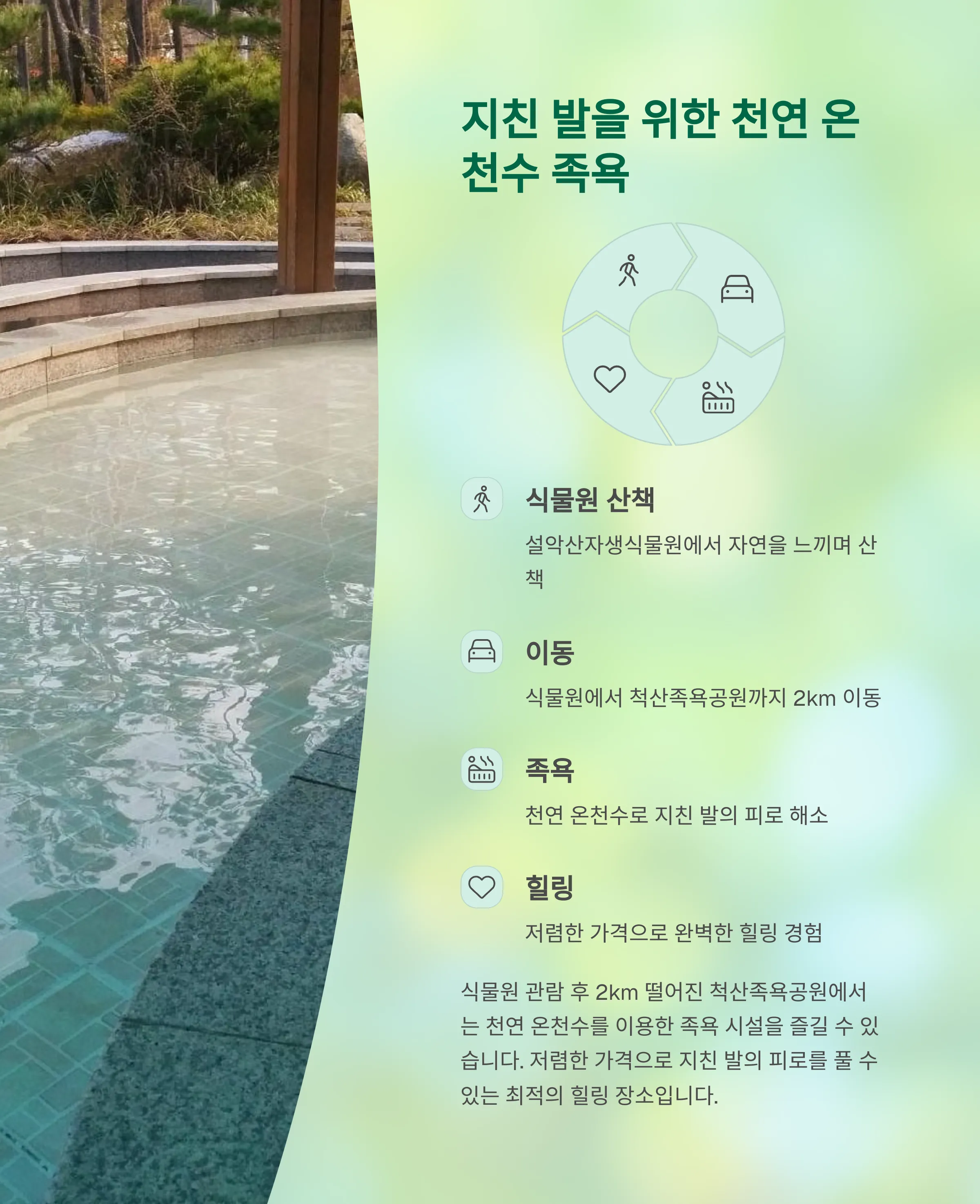 자연의 아름다움과 따뜻한 온천 족욕은 완벽한 힐링을 선물할 것입니다.