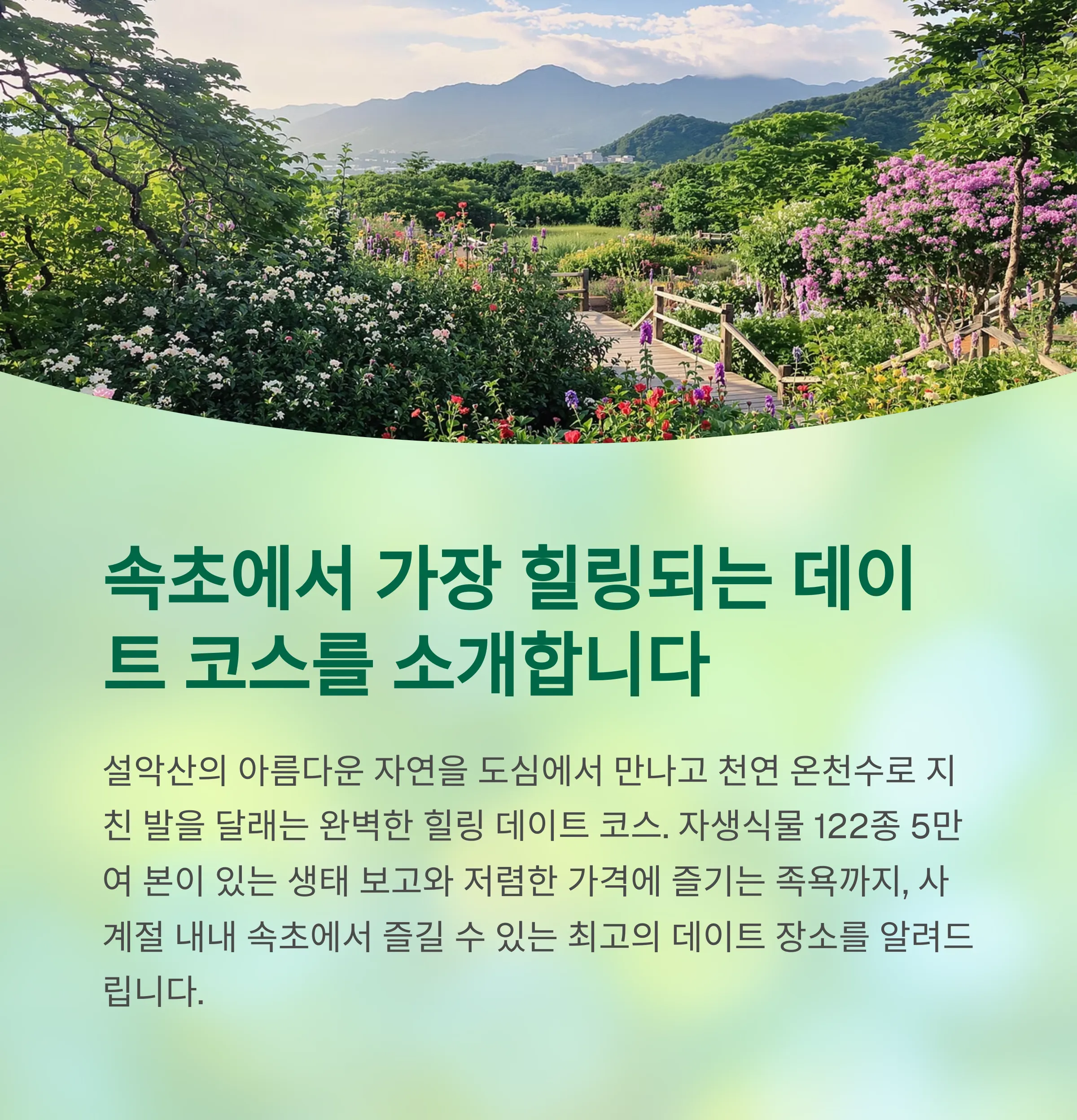 속초에서의 힐링 데이트 코스라면, 설악산자생식물원과 척산족욕공원을 꼭 추천드립니다.
