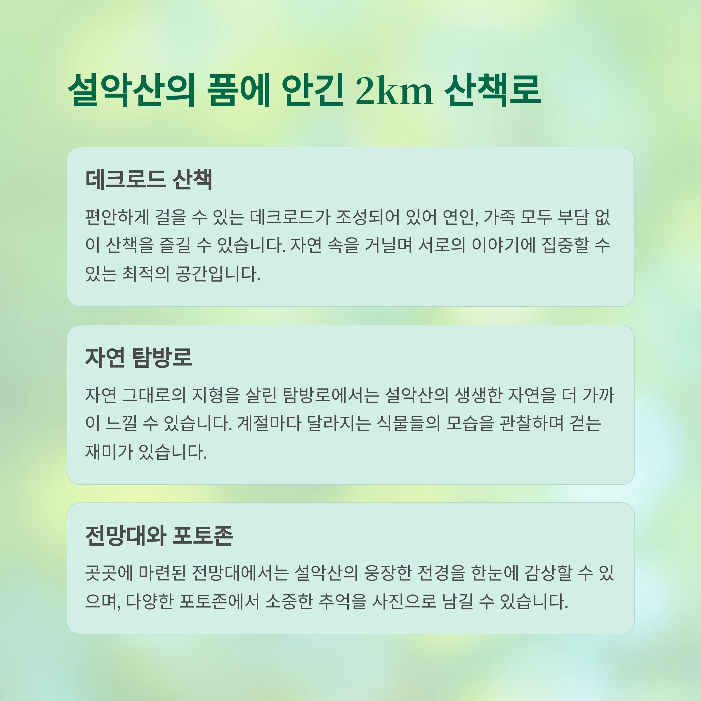 - 인근 속초해변과 영랑호를 추가 방문해보세요.