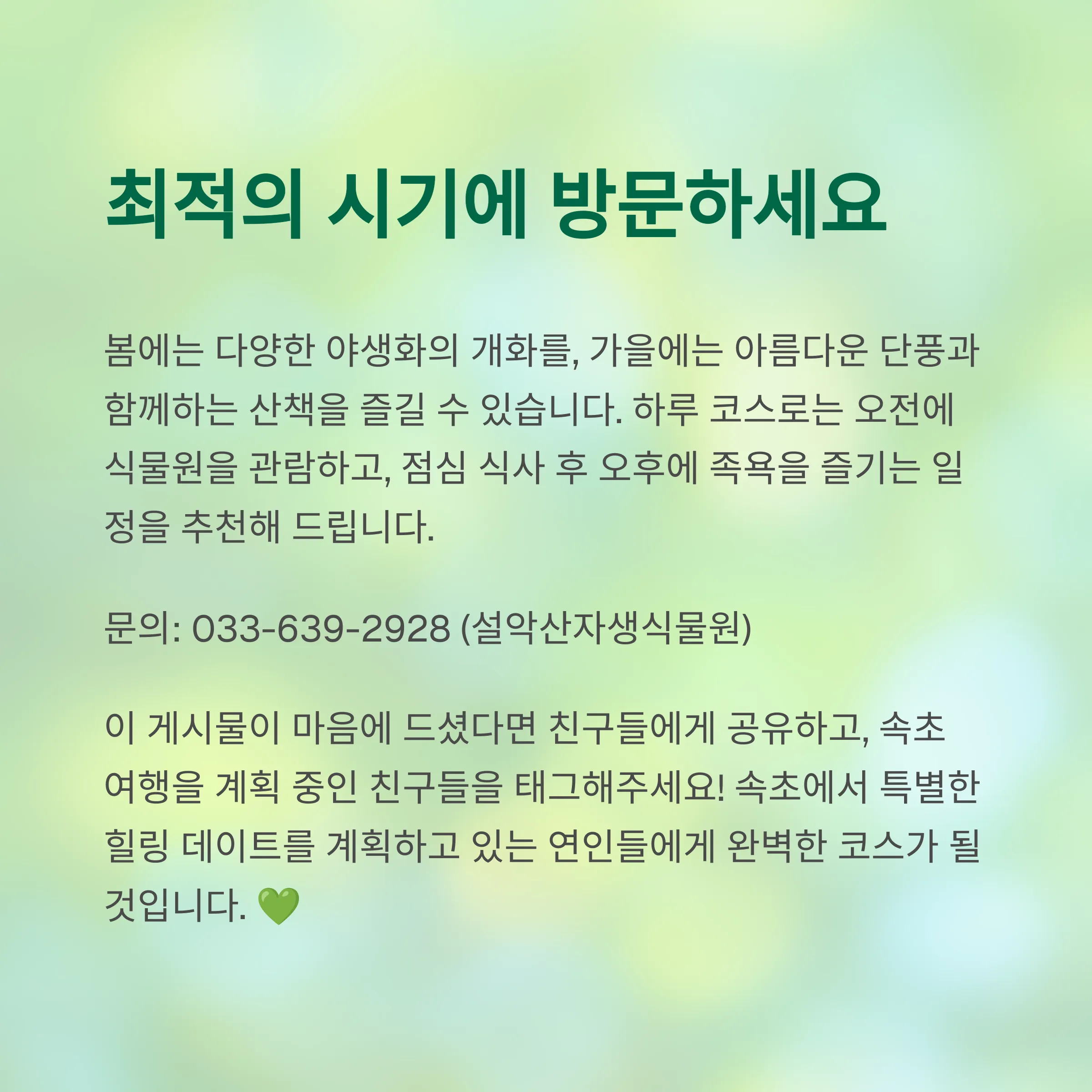 | Q. 설악산자생식물원과 척산족욕공원의 최적 방문 시기는 언제인가요? |