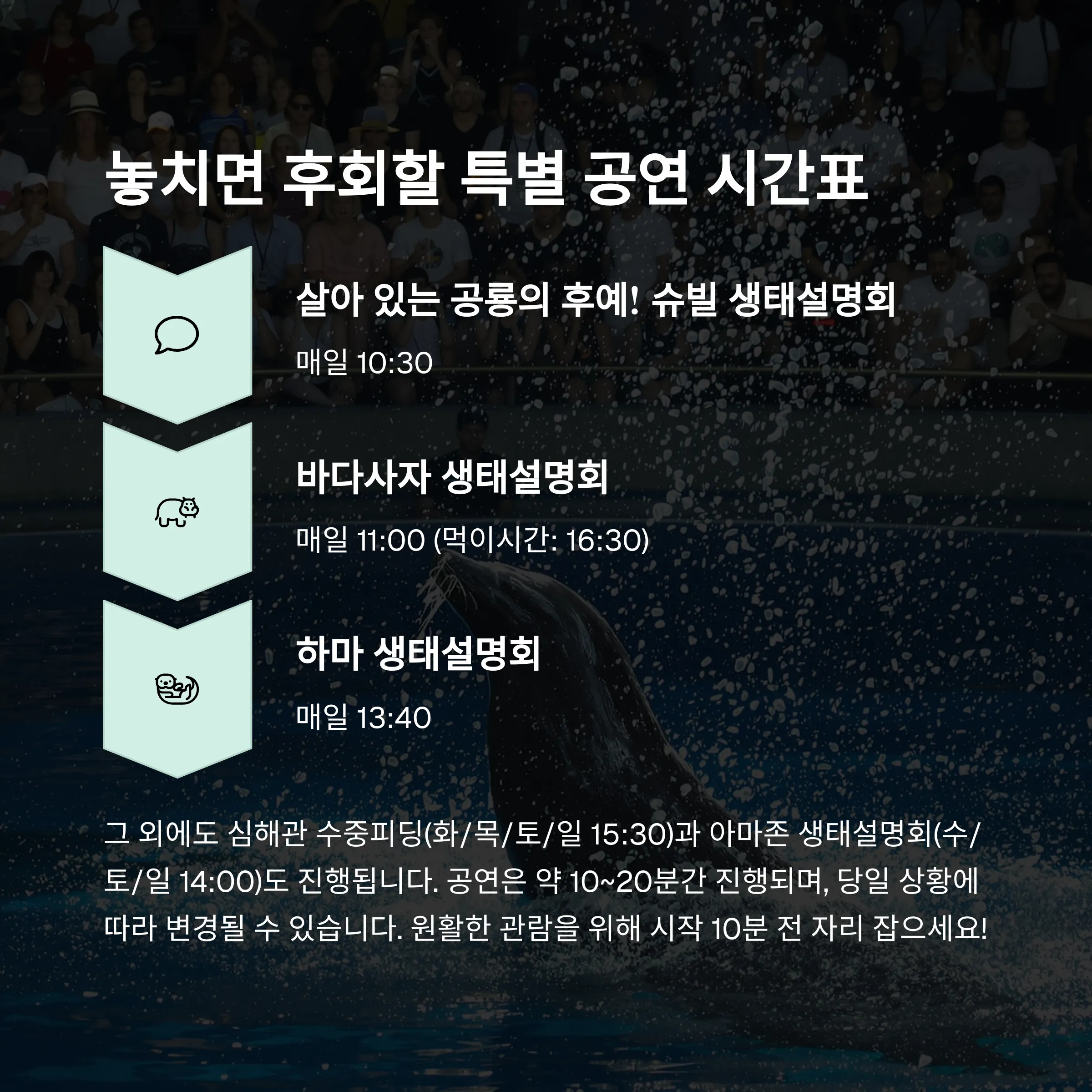 | 11:00 | 2층 바다사자관에서 바다사자 생태설명회 관람 |