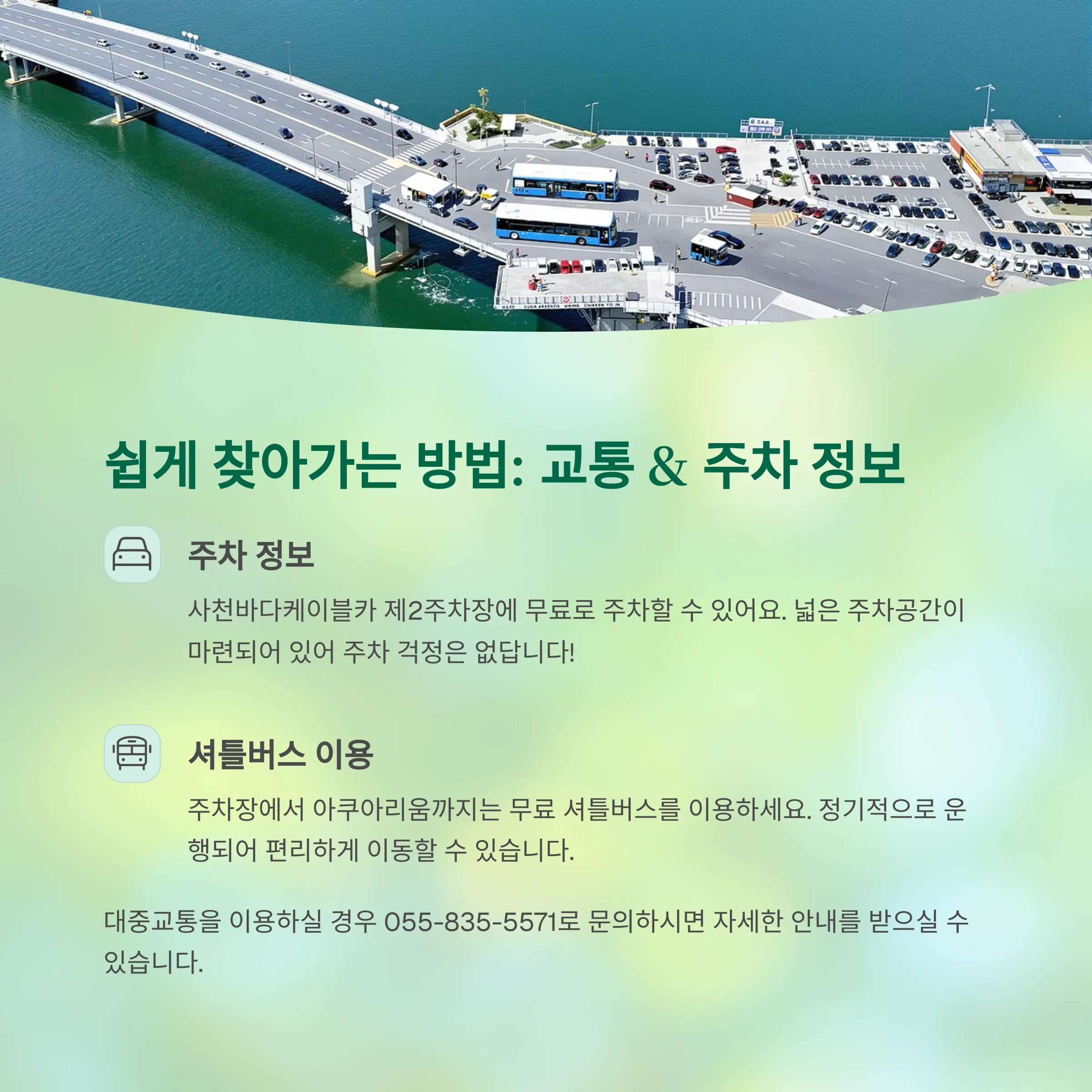 | 주차 & 셔틀 | 사천바다케이블카 제2주차장 + 셔틀버스 이용 가능 또는 사천바다케이블카로 이동 |