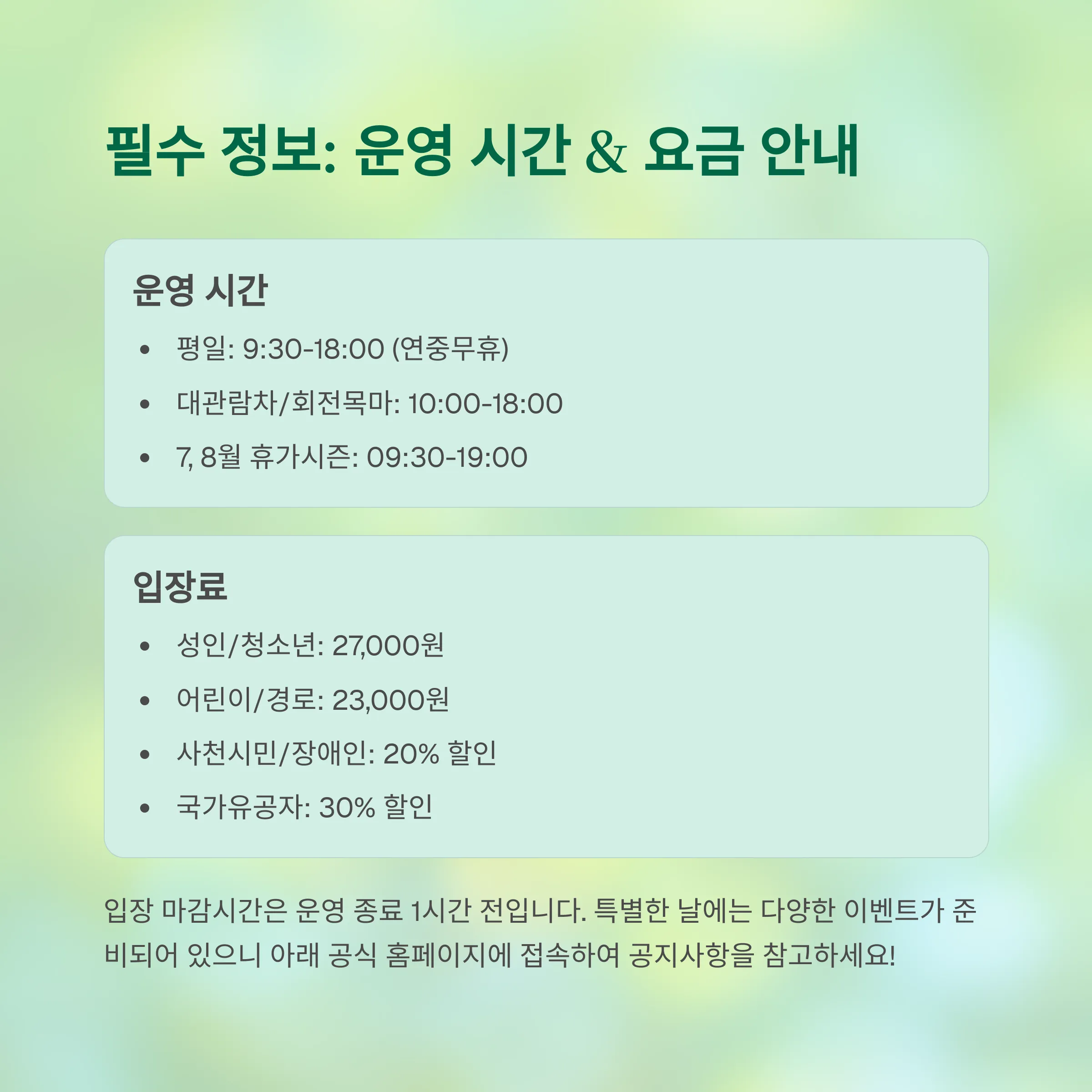 | 운영 시간 | 평일: 9:30-18:00 (연중무휴) 대관람차/회전목마: 10:00-18:00 7, 8월 휴가시즌: 09:30-19:00 |