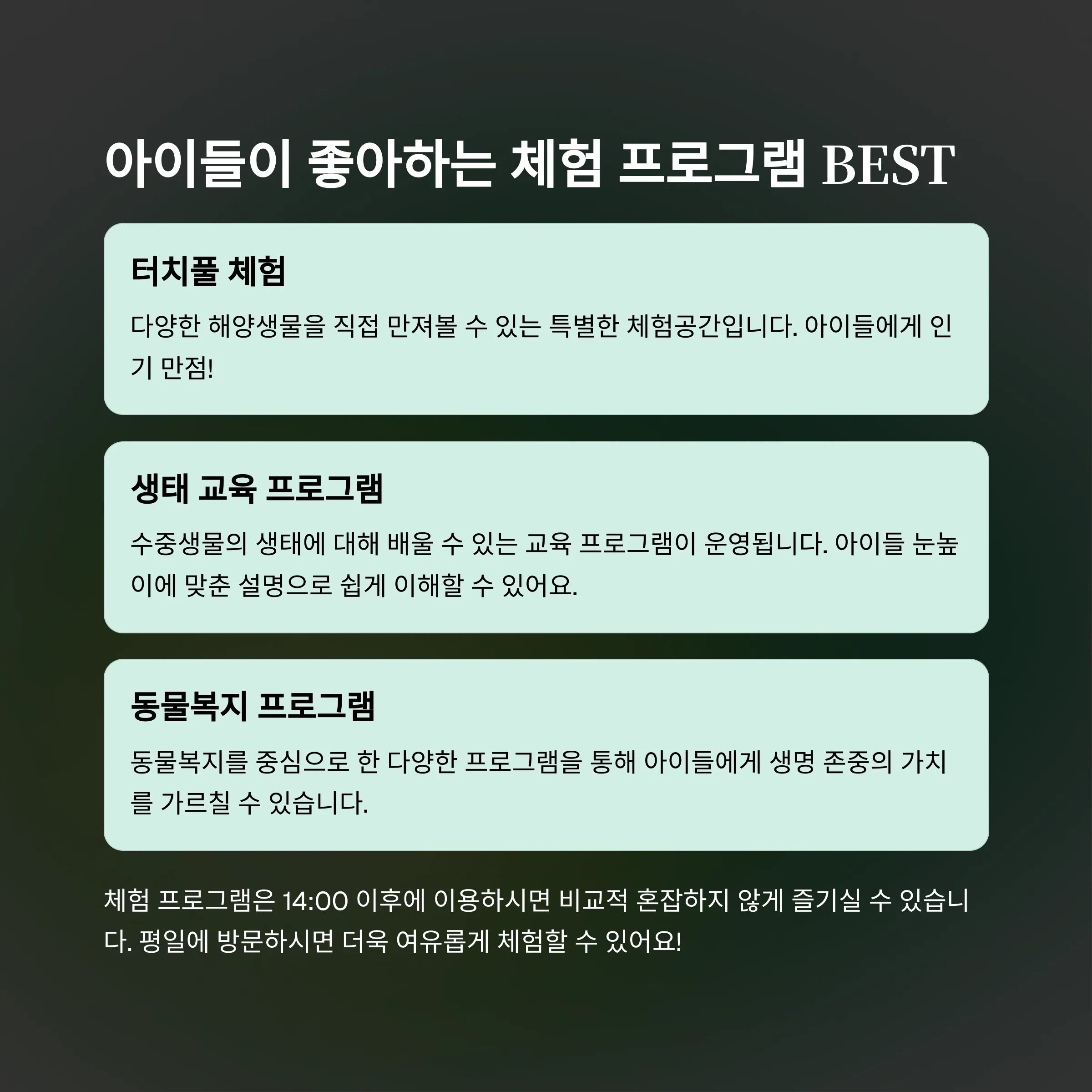 특히 넓은 시설과 다양한 어종 전시, 체험형 프로그램으로 아이들과 방문하기 좋은 장소로 설계되었습니다.