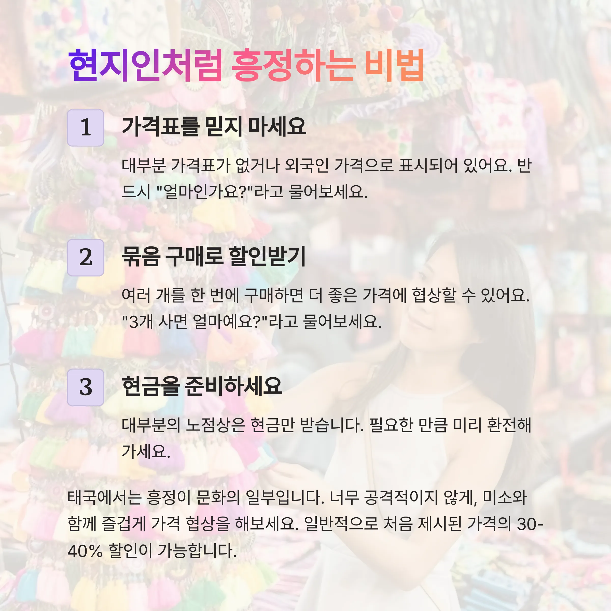 마지막으로, 쇼핑 중에는 가격 협상의 묘미도 빼놓지 말고 경험해 보세요.
