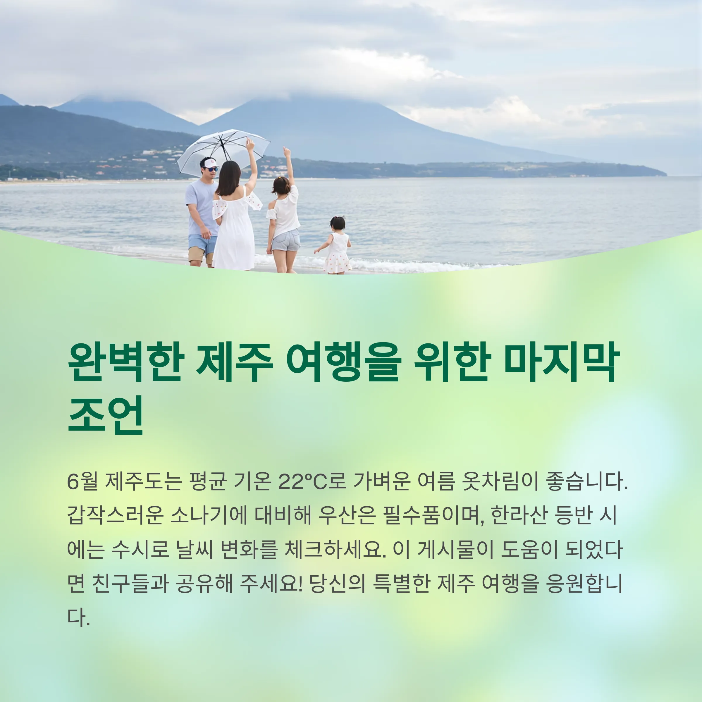 6월 제주도는 가족과 함께 하는 여행에 꼭 맞는 시기입니다. 특히 수국 시즌의 아름다운 자연과 해안 풍경, 그리고 다양한 체험 활동이 매력적입니다.