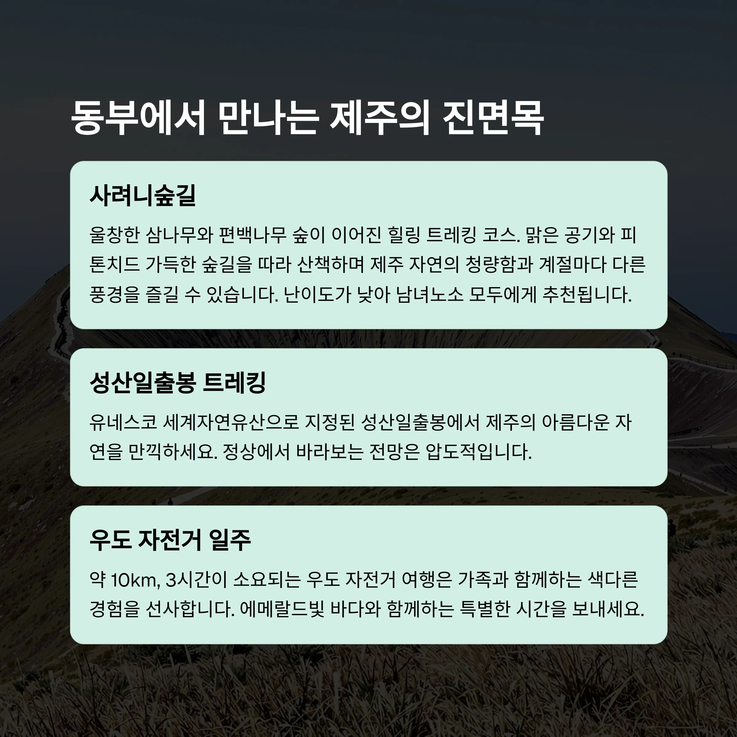 서귀포, 성산, 에코랜드와 같은 자연/문화 명소들은 아이들과 함께 방문하기에 적합하며, 제주도만의 독창적인 매력을 만끽할 수 있습니다.