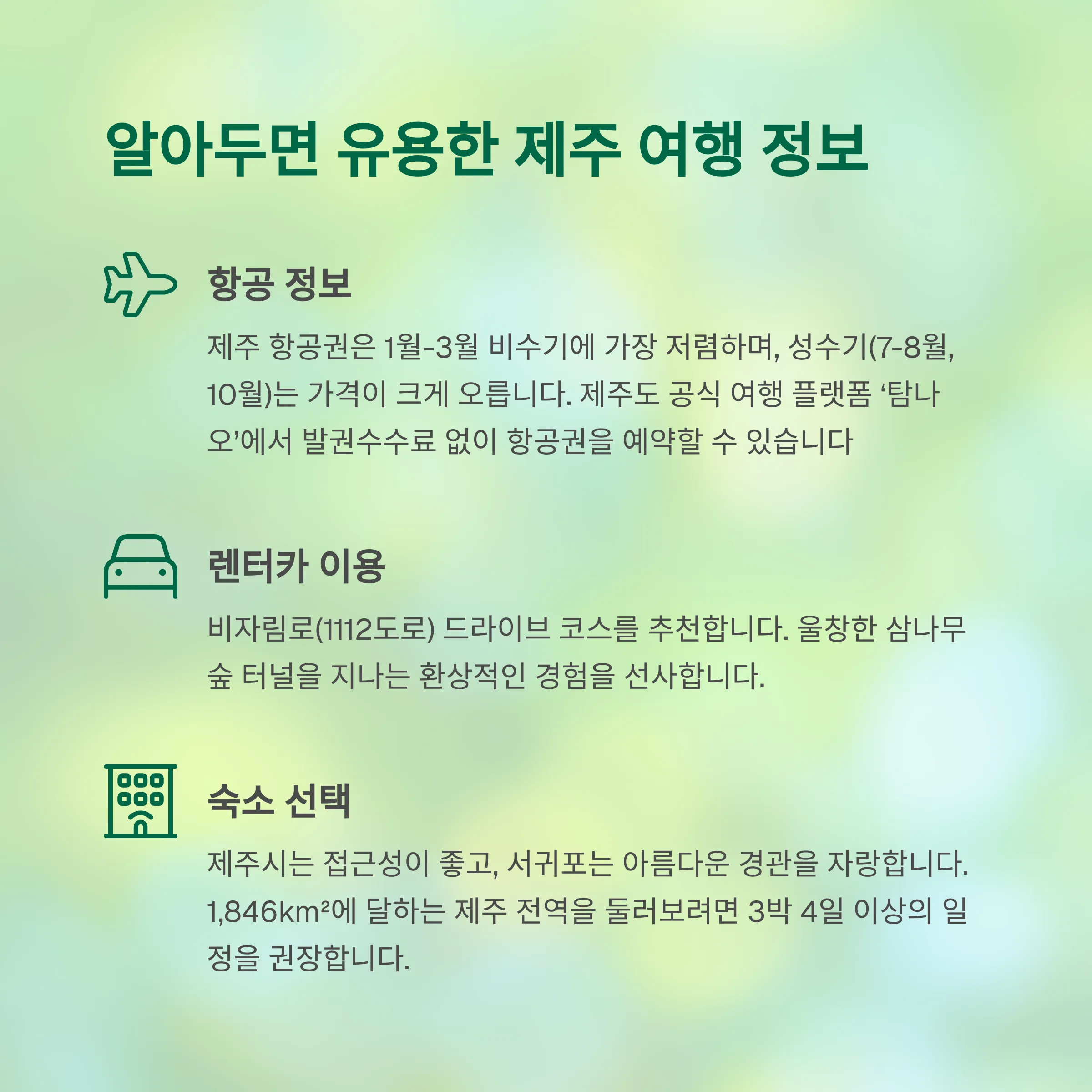 제주 여행은 날씨와 명소 입장 시간을 잘 고려하여 계획하는 것이 중요합니다. 사전에 예약하거나 일정을 조율하며, 현장 상황에 맞춰 유연하게 여행하도록 준비하세요!