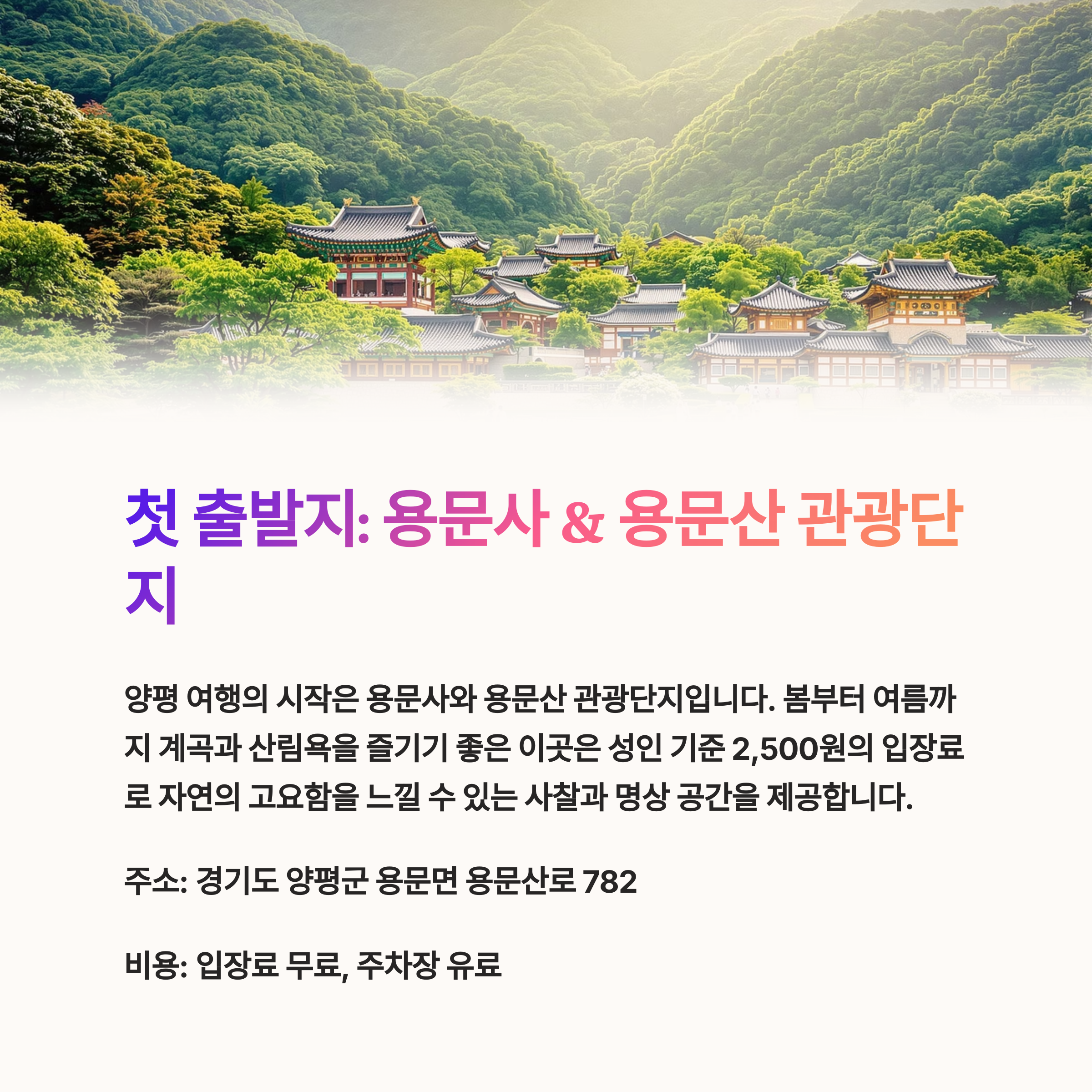 특히 용문산과 두물머리는 사계절 모두 아름다운 풍경을 자랑하며, 다양한 연령대가 방문하기 좋은 관광지입니다.