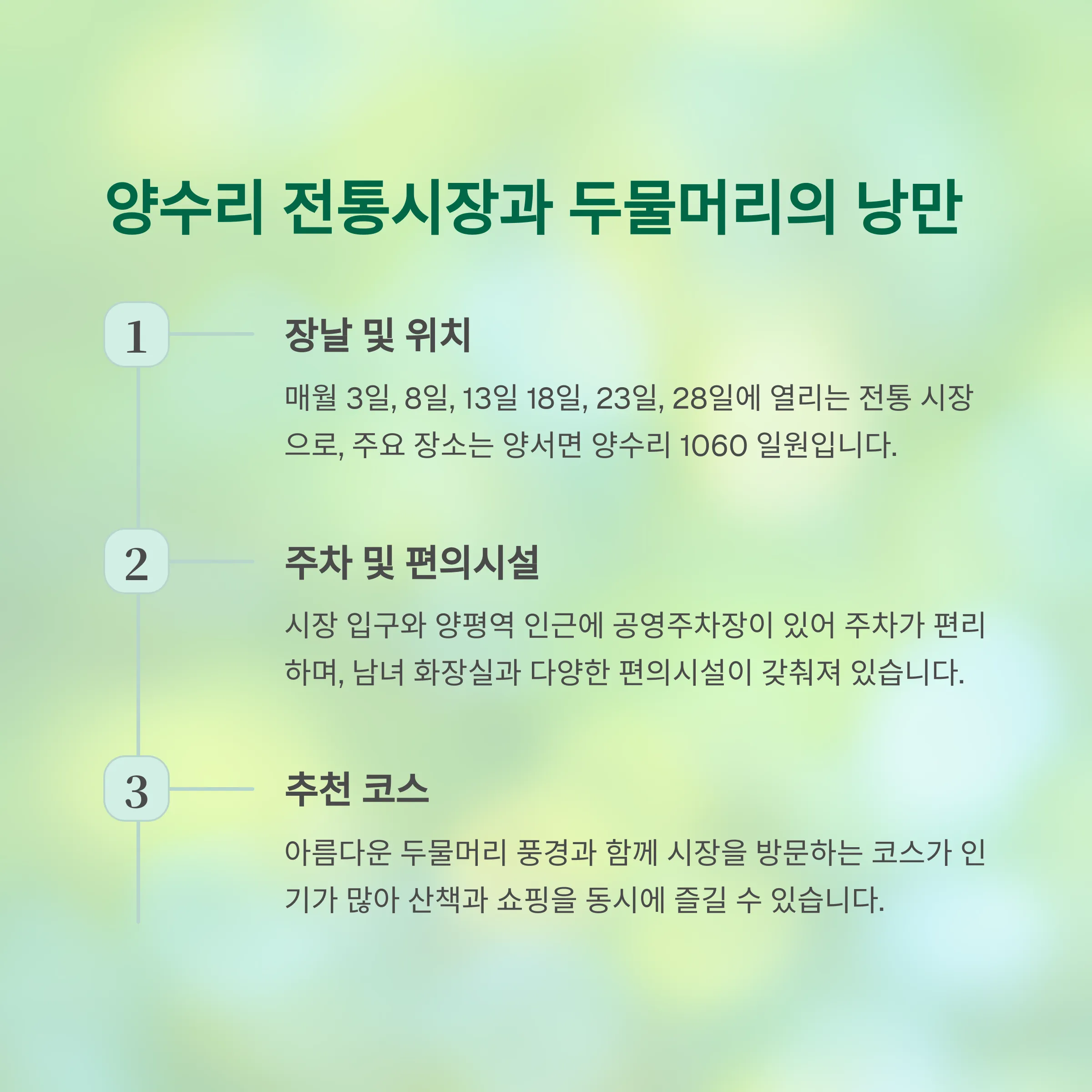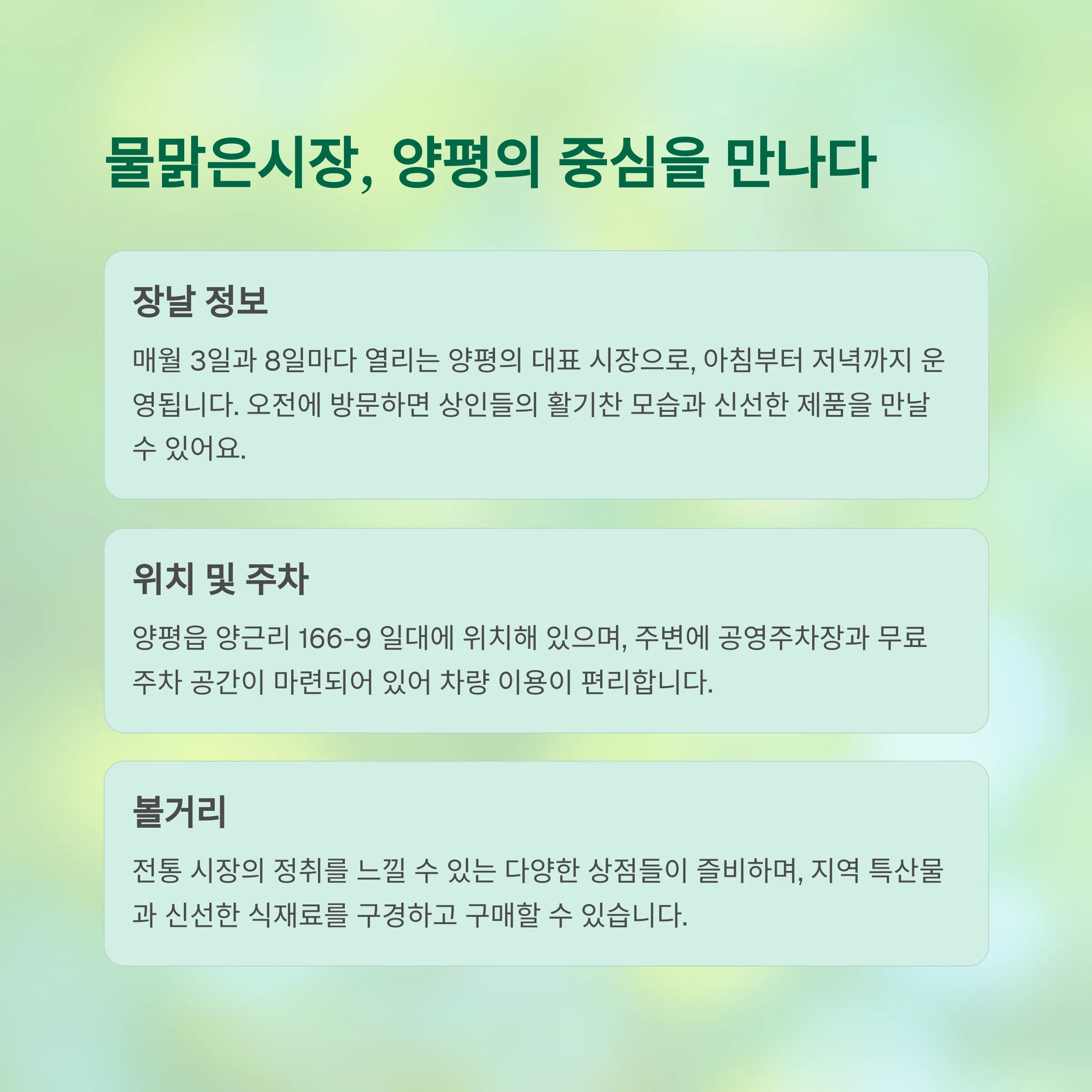 | 양평 물맑은시장 | 매월 3일, 8일 주차 가능 및 먹거리 풍부 |