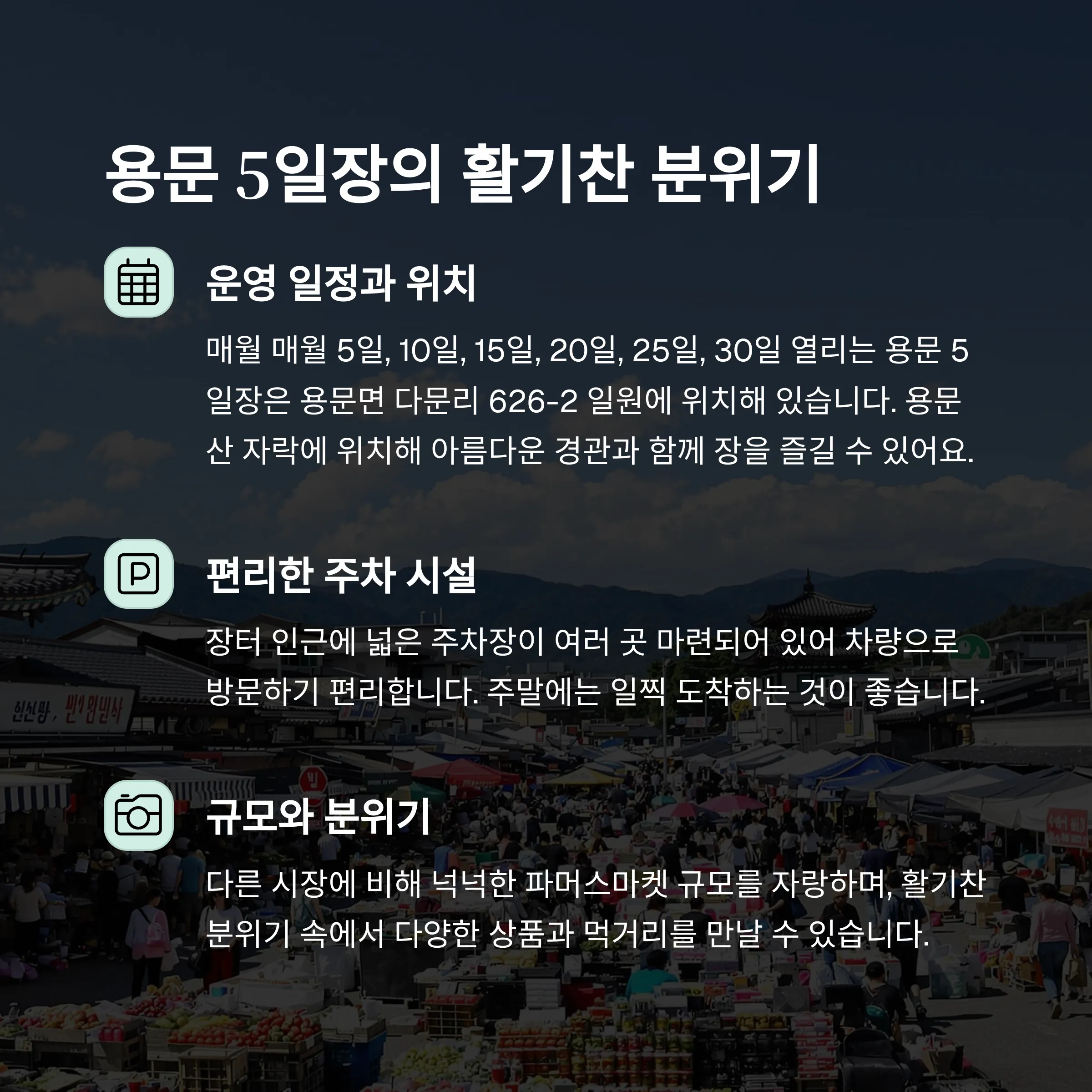 | 용문 5일장 | 용문면 다문리 626-2 (농로 주차 가능) |