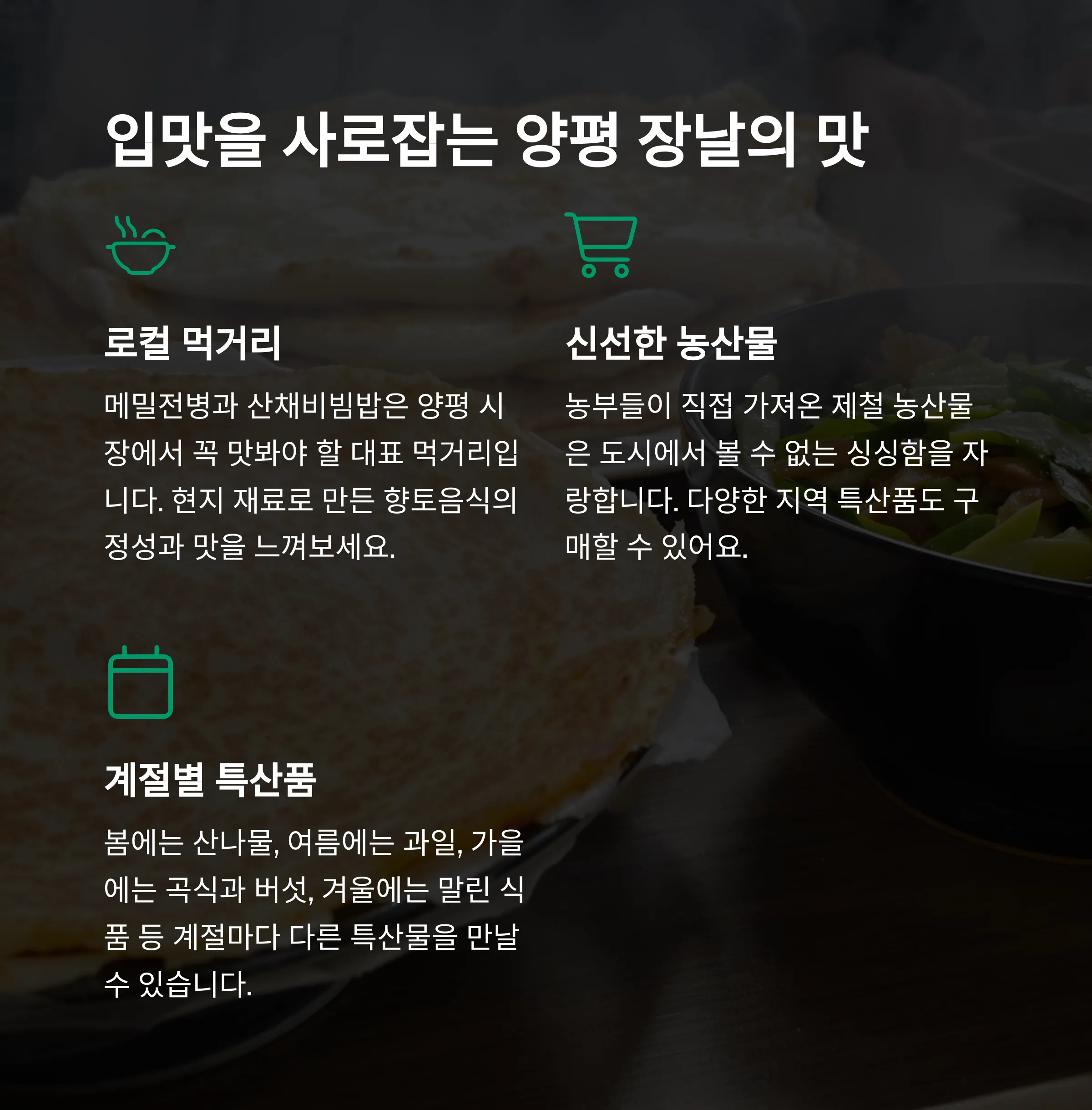 특히, 양평의 자연미는 각각의 시장을 더욱 역동적이고 풍부하게 만들어줍니다.