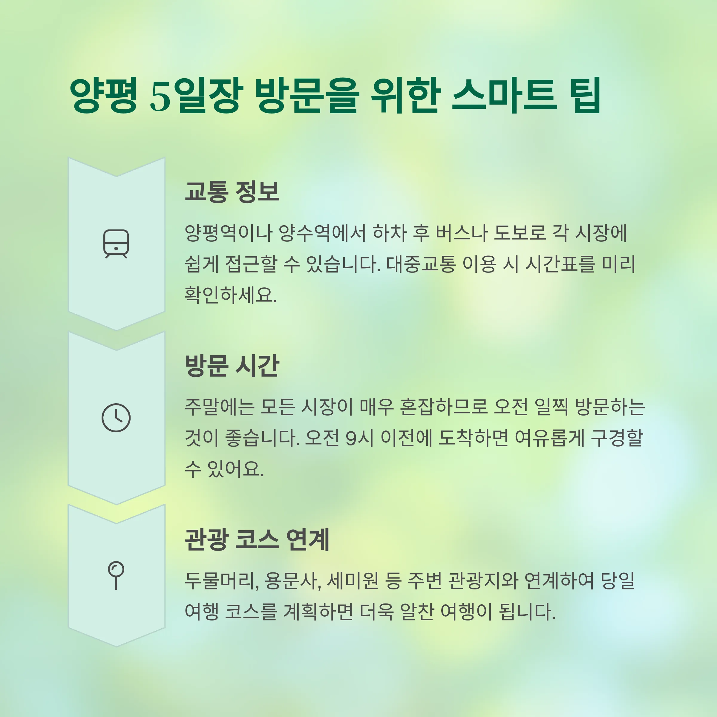 두물머리 등 가까운 관광지와 시장을 함께 보면 더욱 알찬 하루가 될 수 있습니다.
