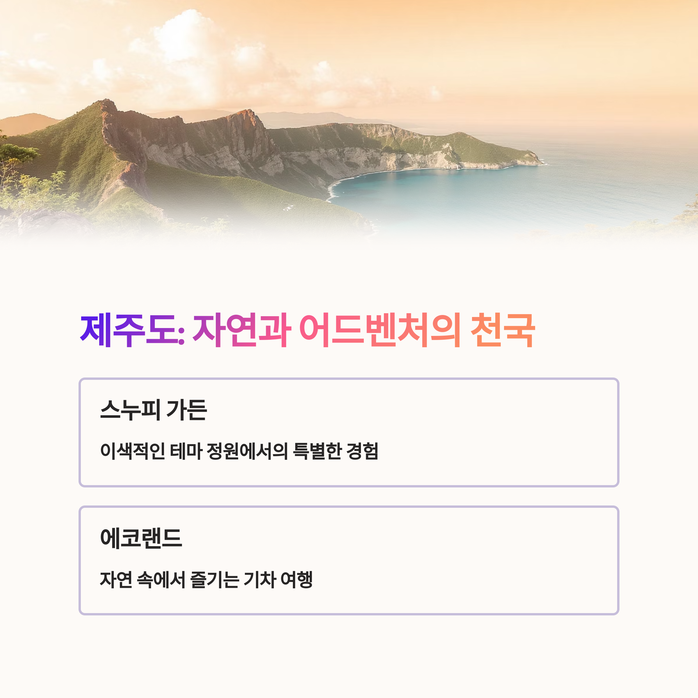 반면 제주도는 자연과 어드벤처 활동을 함께 즐길 수 있는 곳으로 인기가 높습니다.