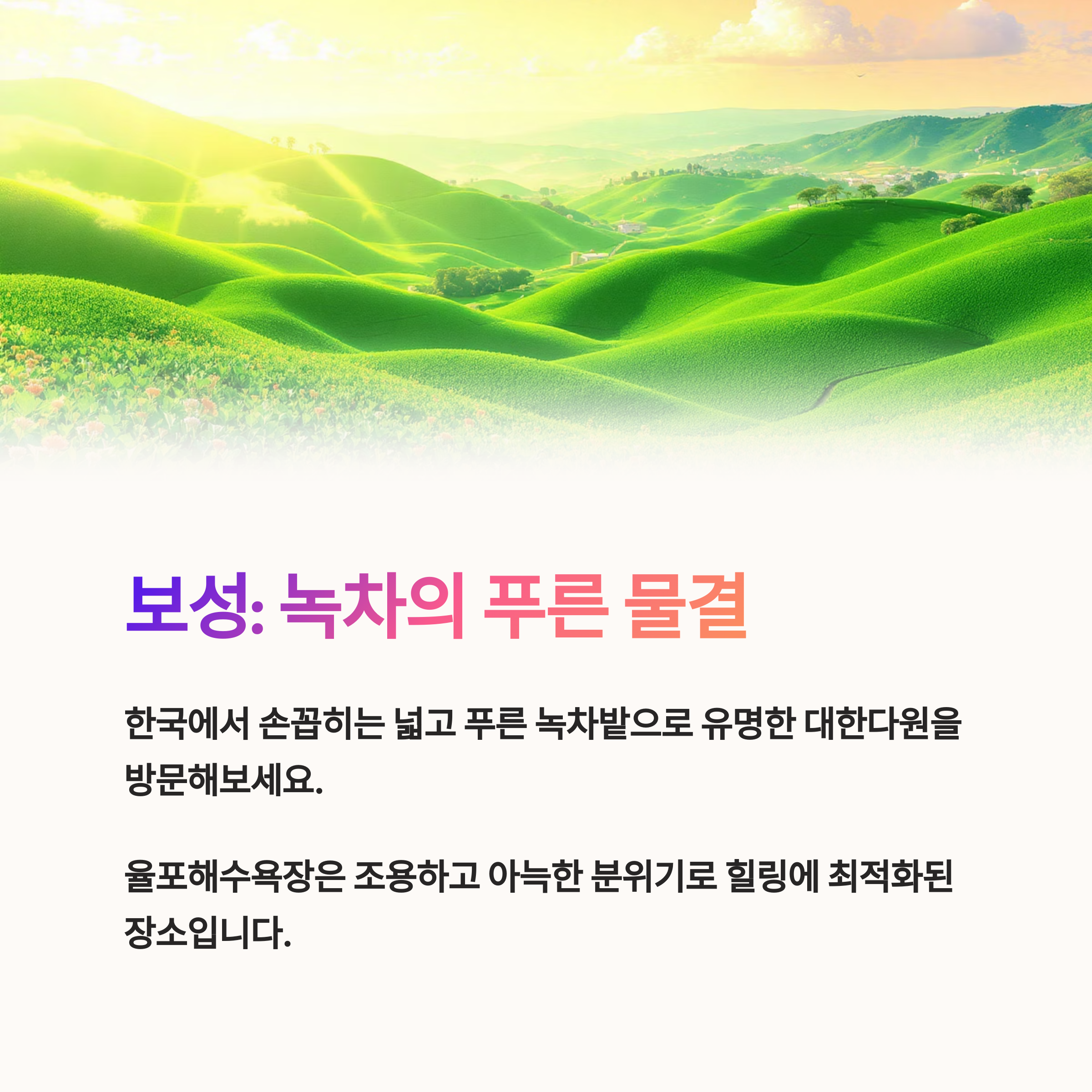 | 보성의 자연 속에서 힐링을 원하신다면 "대한다원"을 꼭 추천드립니다. 이곳은 한국에서도 손꼽히는 넓고 푸른 녹차밭으로 유명합니다. 특히 여름에는 이국적인 풍경이 잘 어우러져 많은 관광객들이 방문합니다. 또한, 보성의 율포해수욕장은 조용하고 아늑한 분위기로 힐링에 최적화된 장소입니다. 해변과 인접한 숙박시설과 자연풍경이 어우러져 가족, 친구 또는 개인 여행객들에게 적합한 선택지입니다. 자연 속에서 여유를 찾고 싶은 분들께 보성은 꼭 한번 방문해볼 만한 추천 여행지입니다. |