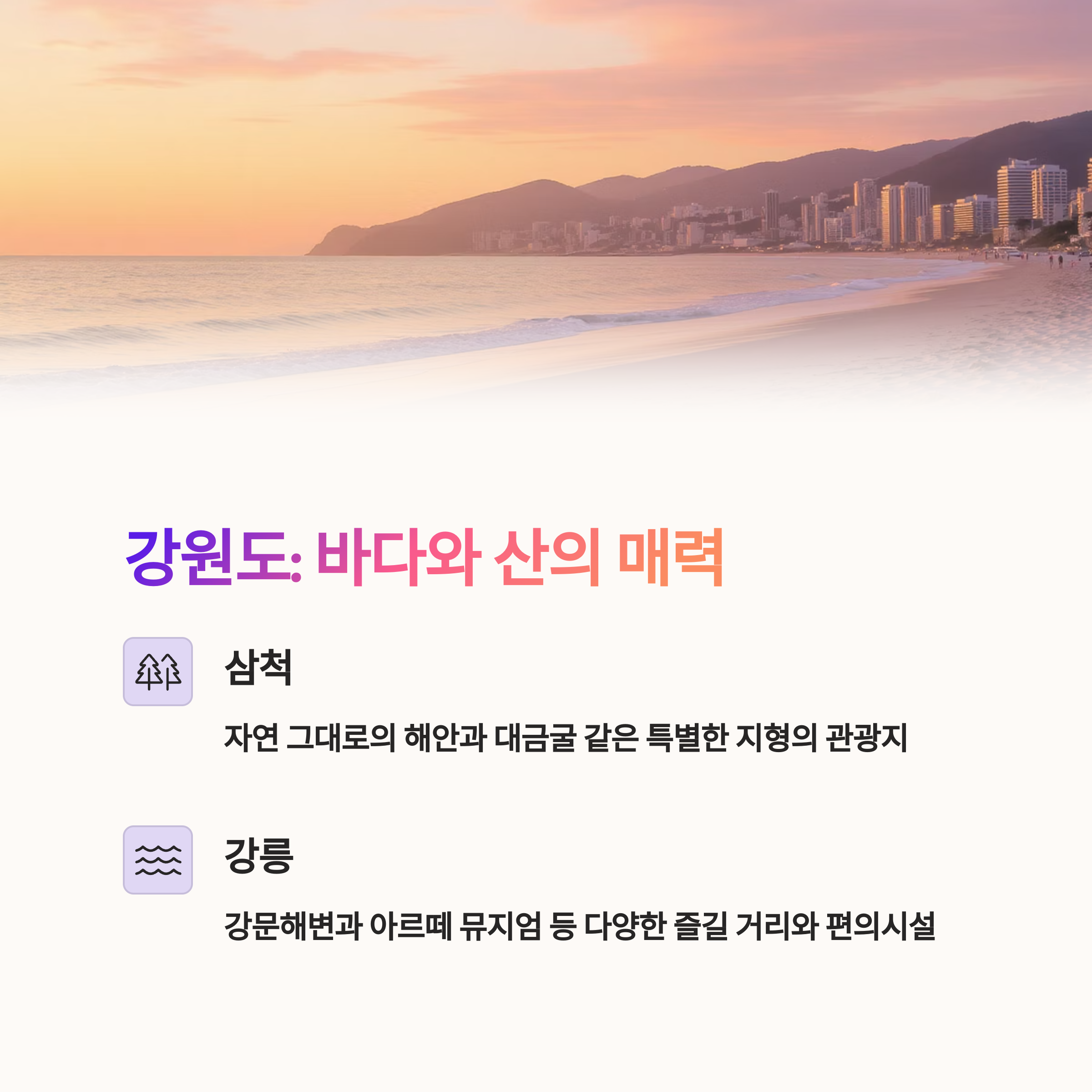 | Q. 강원도 여행지 중 삼척과 강릉은 어떤 점이 다른가요? |