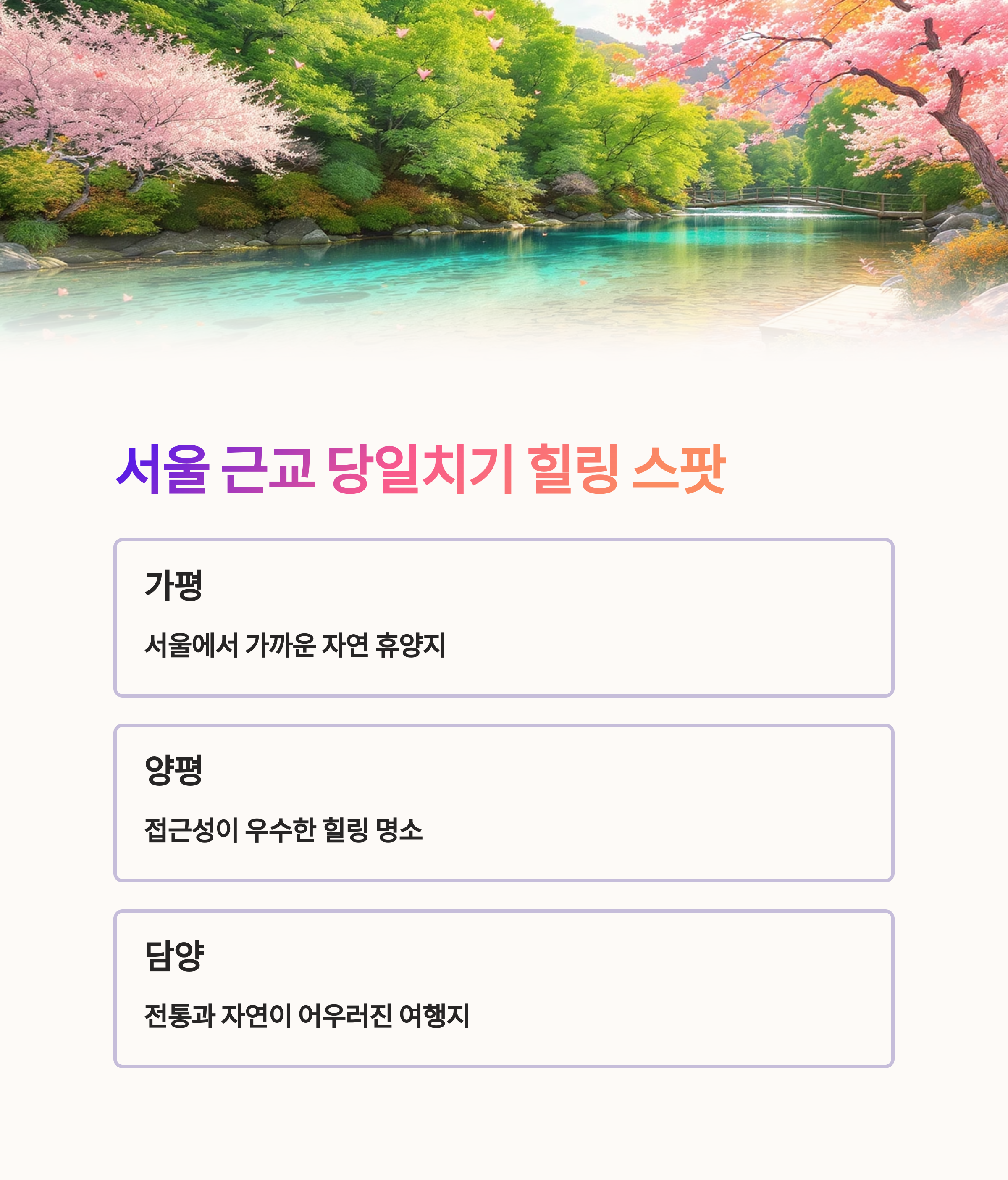 가평과 담양은 서울 근교에서 출발하기 좋은 힐링 명소들입니다.
