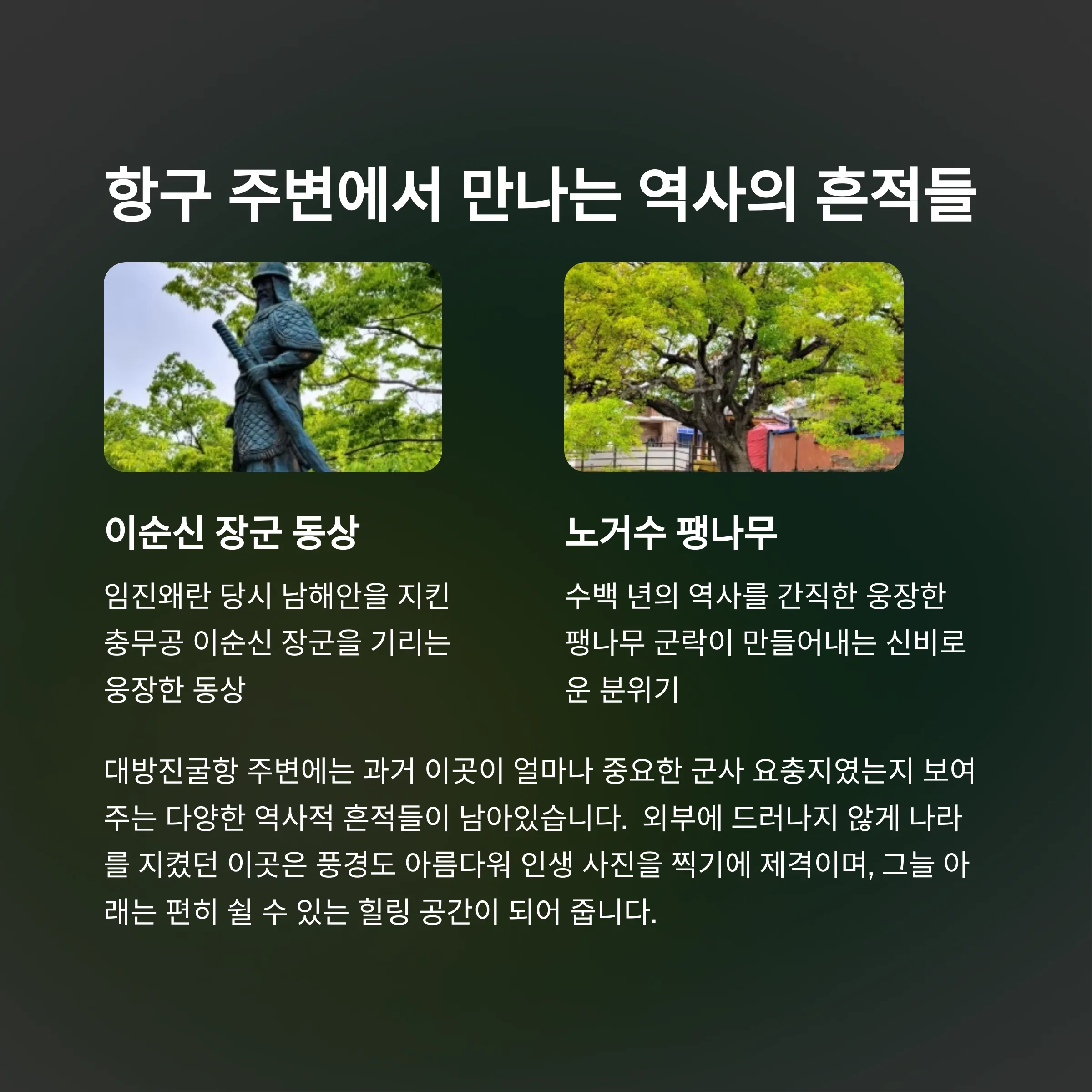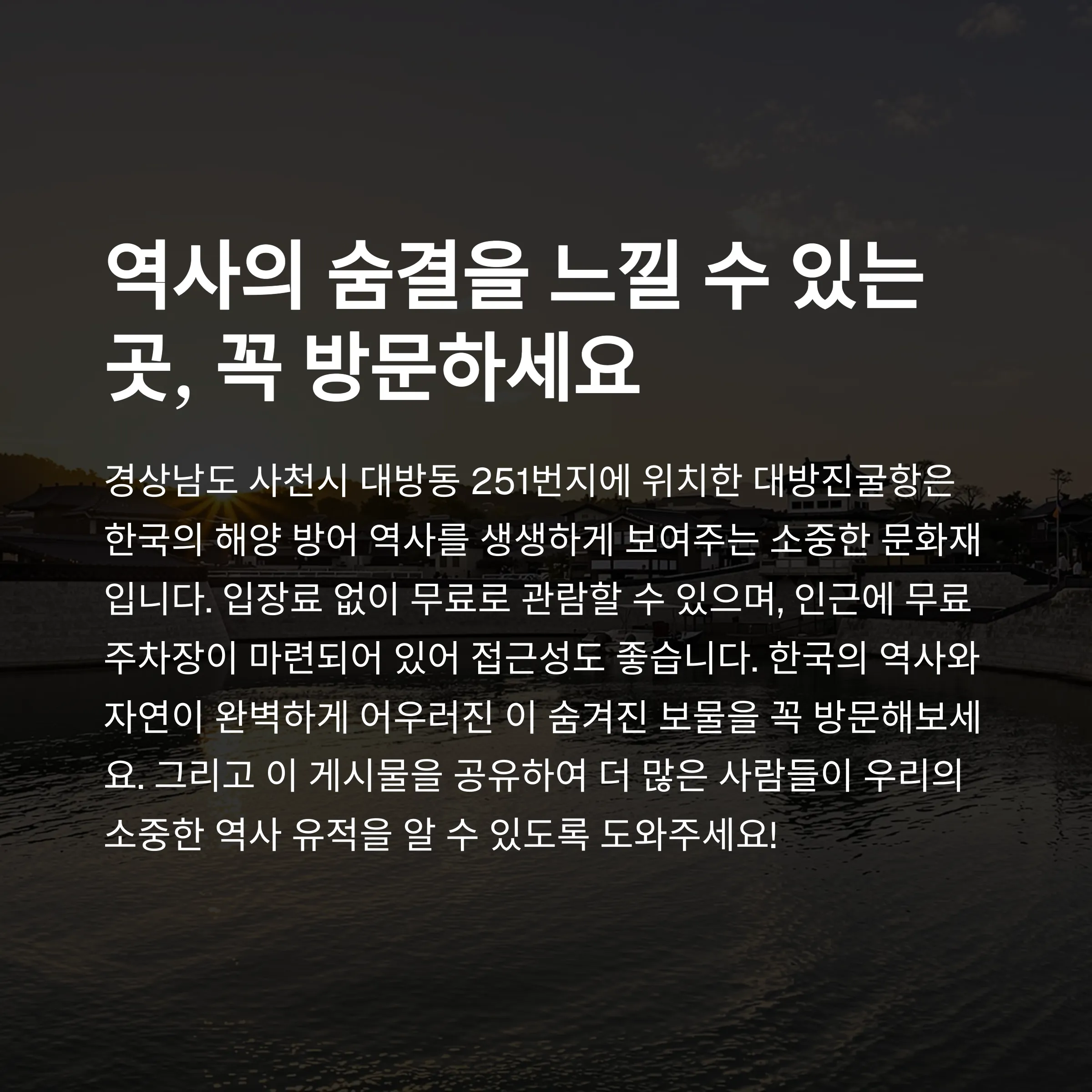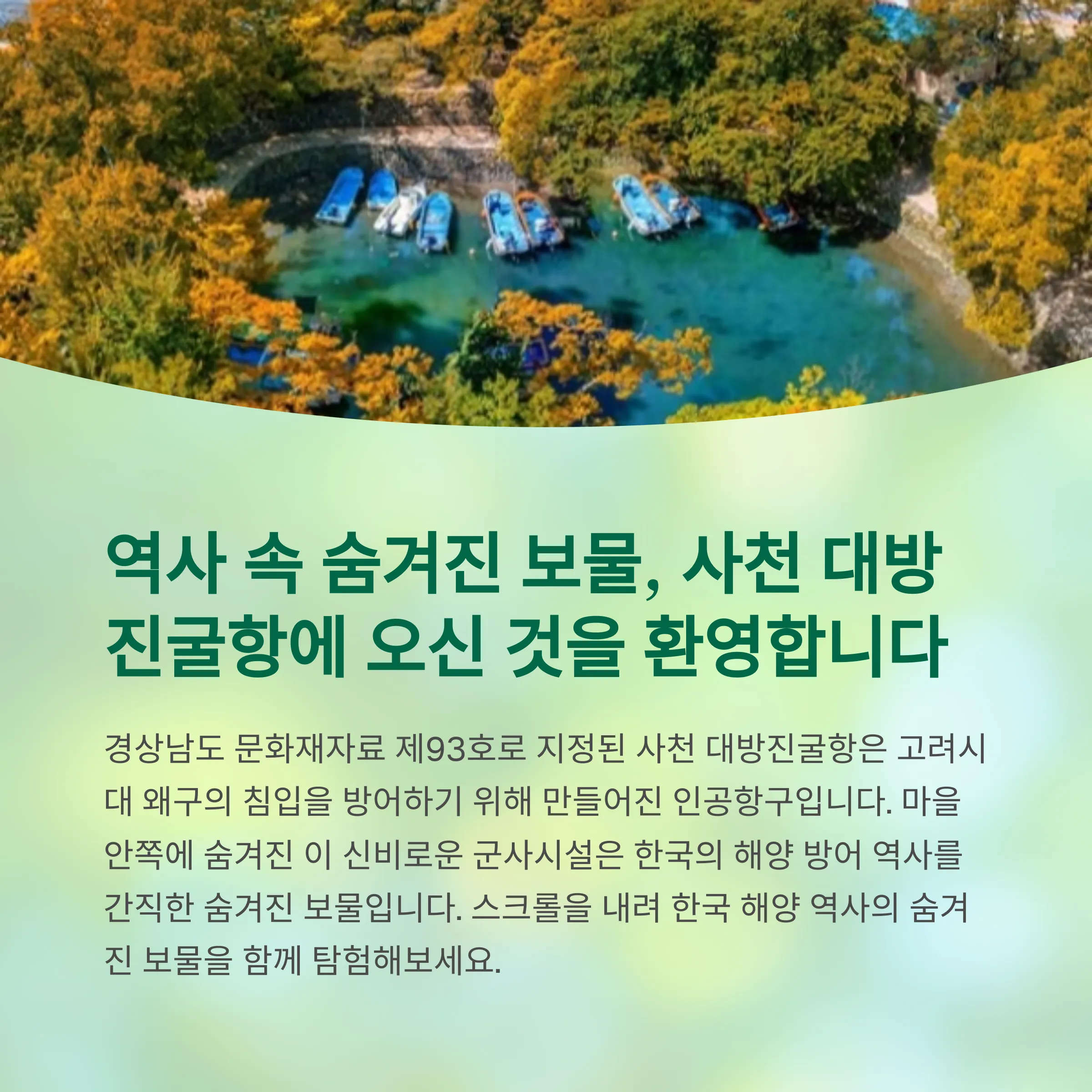 사천 대방진굴항은 역사적 가치와 자연의 힐링이 어우러진 특별한 여행지가 될 것입니다.
