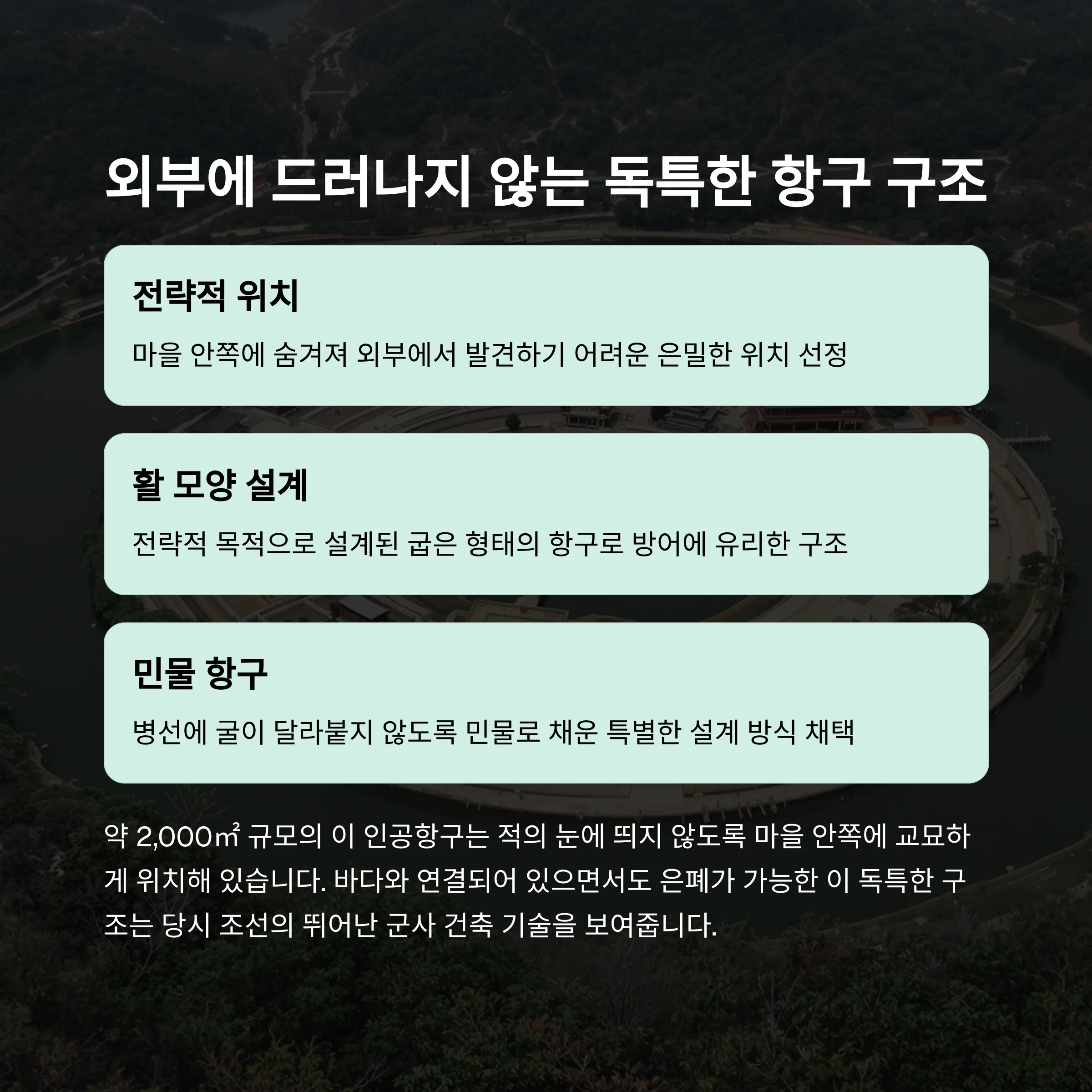 | 건축 목적 | 군선과 병력을 숨길 수 있는 천연 요새 |