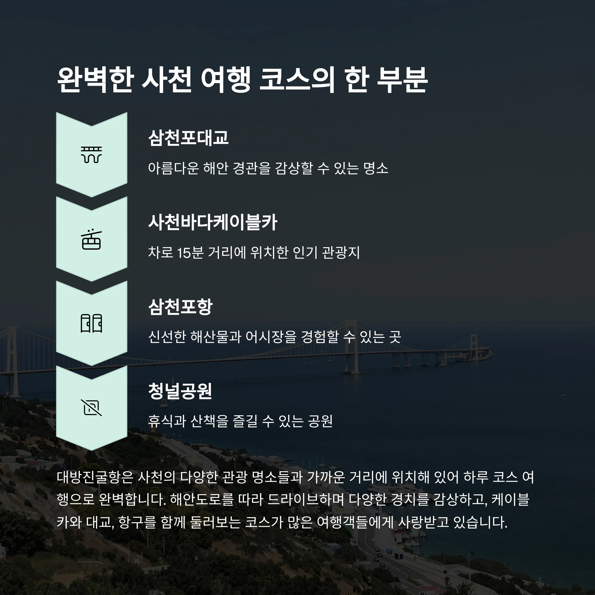 | 대방진굴항 인근에는 다양한 관광 명소가 위치해 있어 하루 종일 즐길 수 있습니다. 삼천포대교는 대방진굴항과 가까워 자동차로 이동하기 편리하며, 멋진 바다 풍경과 함께 드라이브 코스로 제격입니다. 청널공원 역시 유명한 장소로, 삼천포대교의 전경을 한눈에 담을 수 있는 아름다운 포인트입니다. 조금 더 시간을 있다면 용두공원에 들러 산림욕과 실개천 산책을 즐길 수 있습니다. 이 외에도 사천바다케이블카와 같은 체험형 관광 콘텐츠 또한 가까운 거리에서 즐길 수 있어 추천드립니다. |