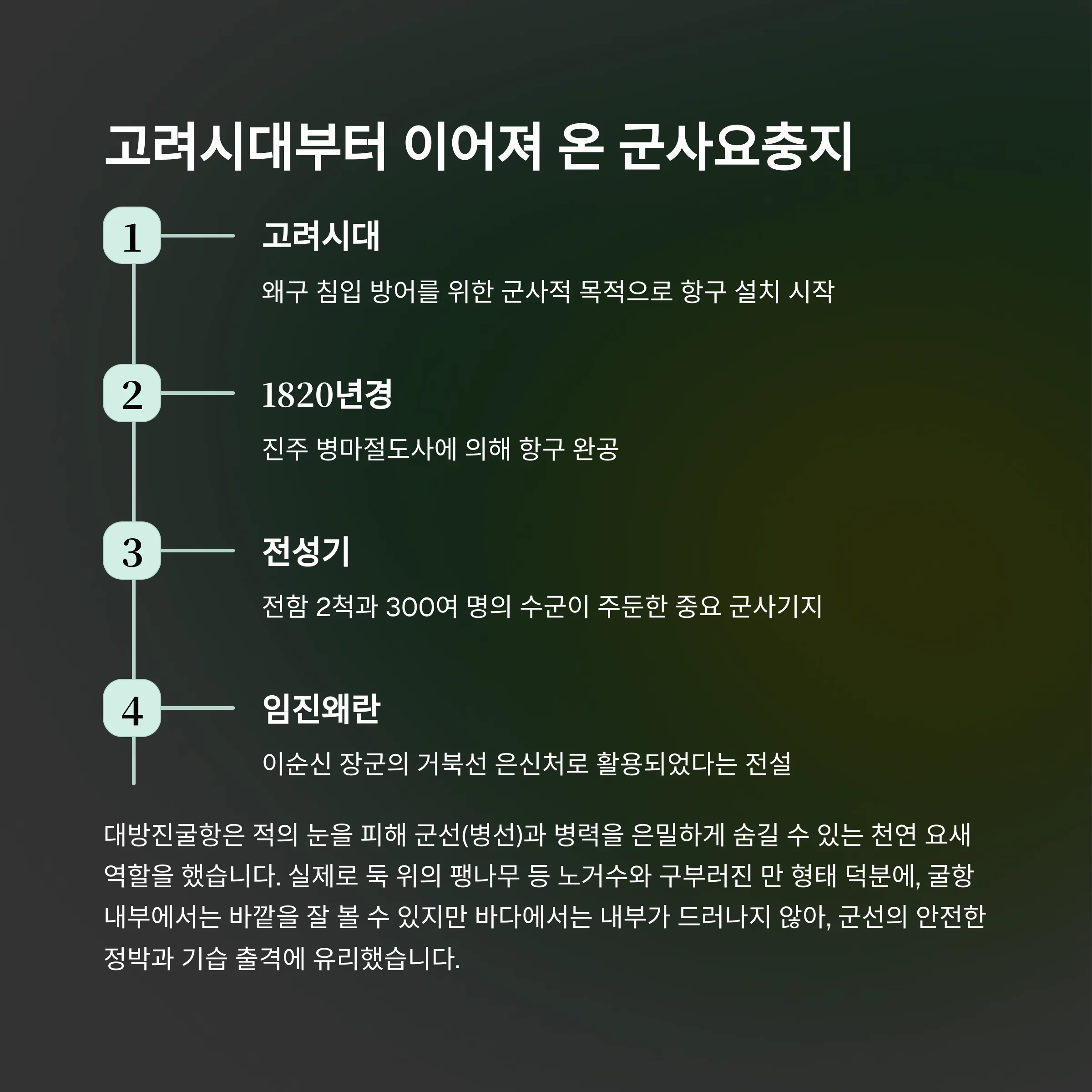 오늘은 사천 대방진굴항에 대해 상세히 소개드릴게요.