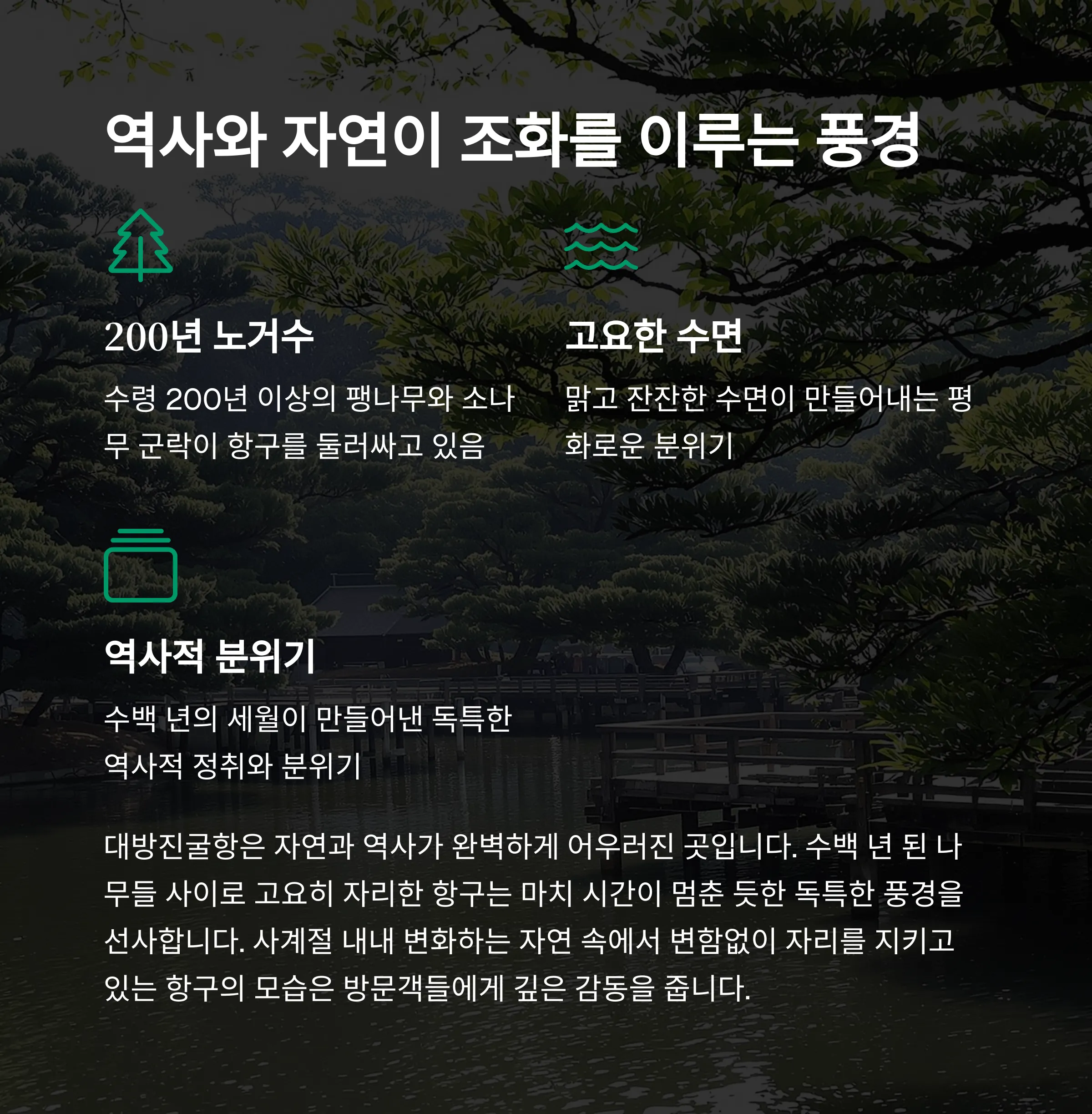 | Q. 왜 대방진굴항은 가족 여행 및 데이트 코스로 인기가 많을까요? |