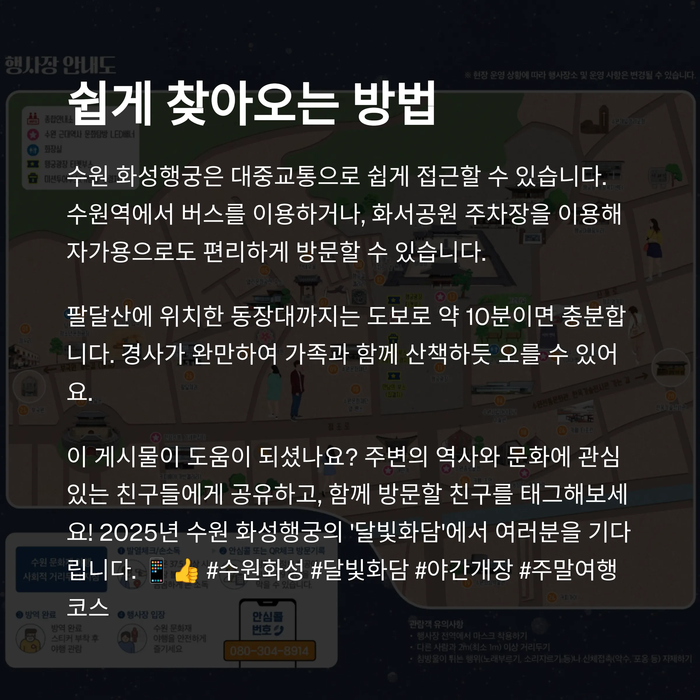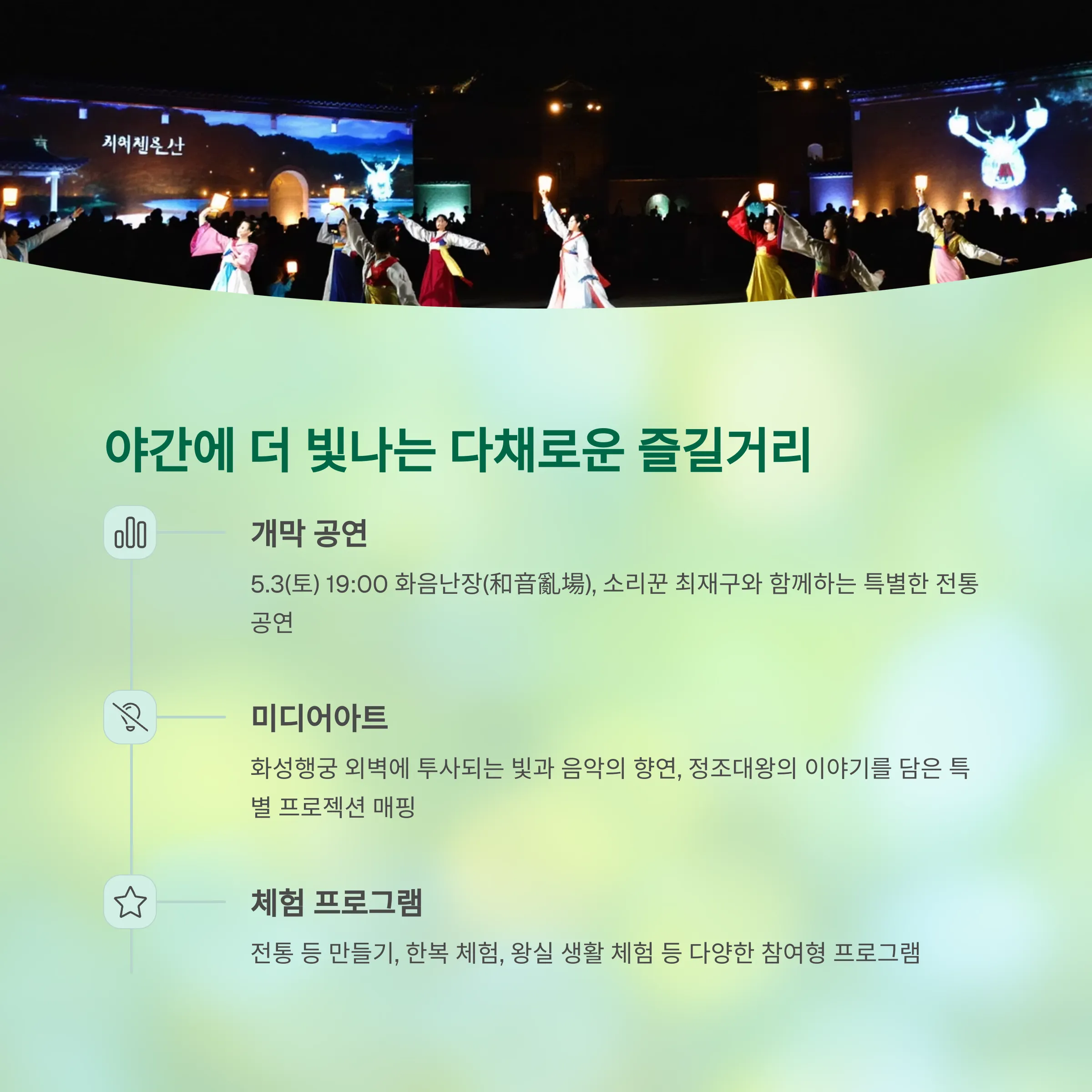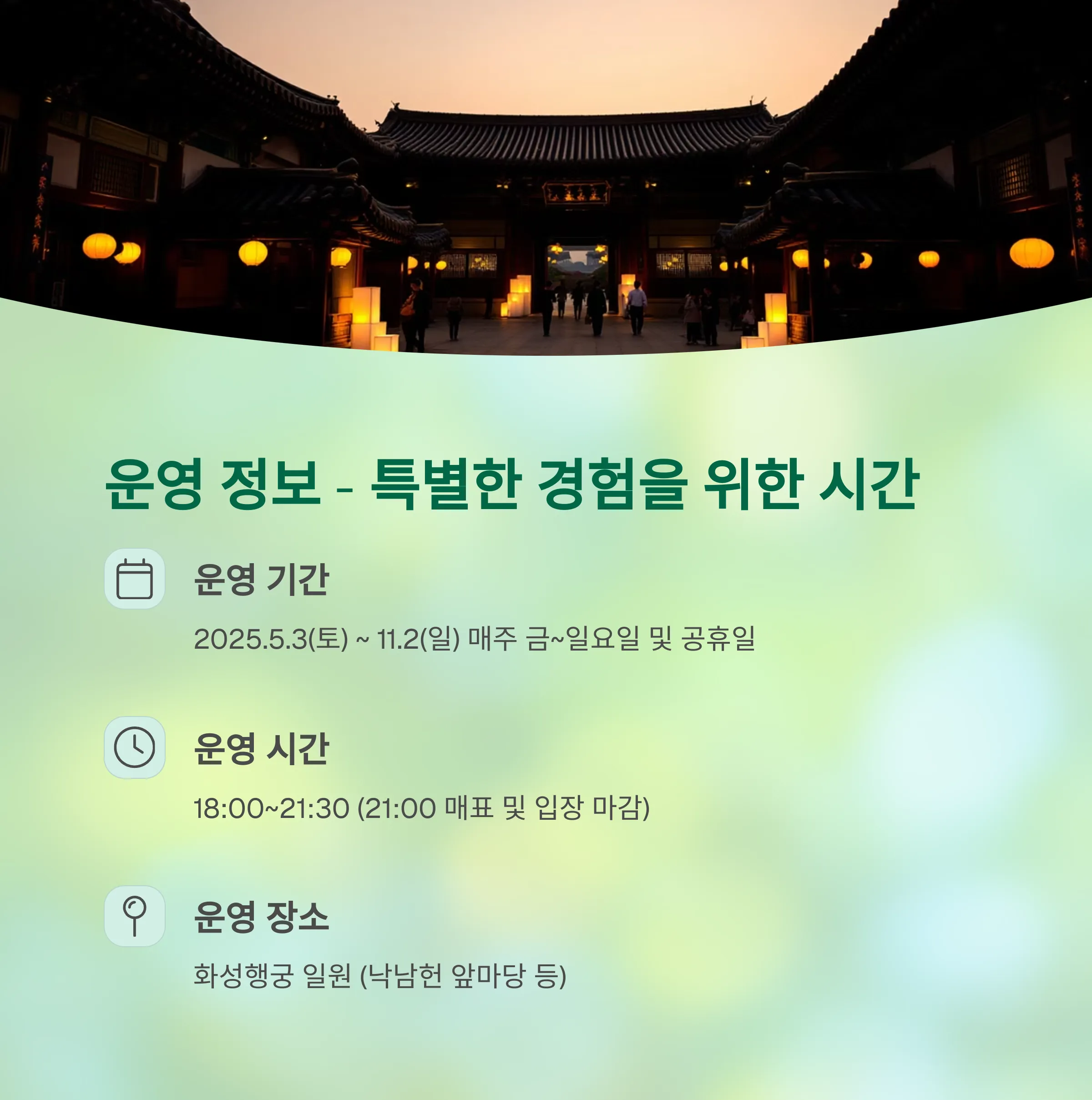 | Q. 수원 화성행궁 야간개장 시 주의해야 할 점이 있을까요? |