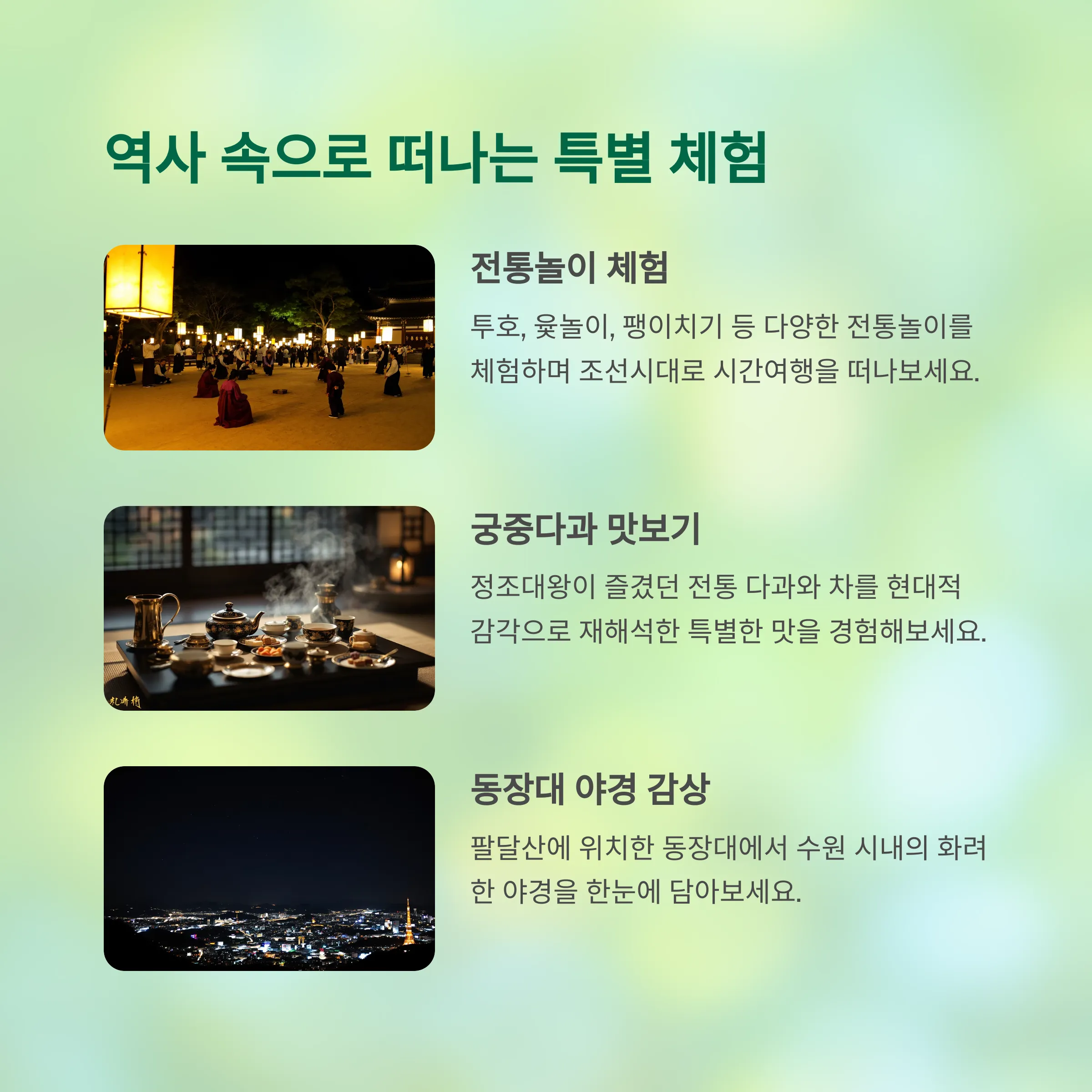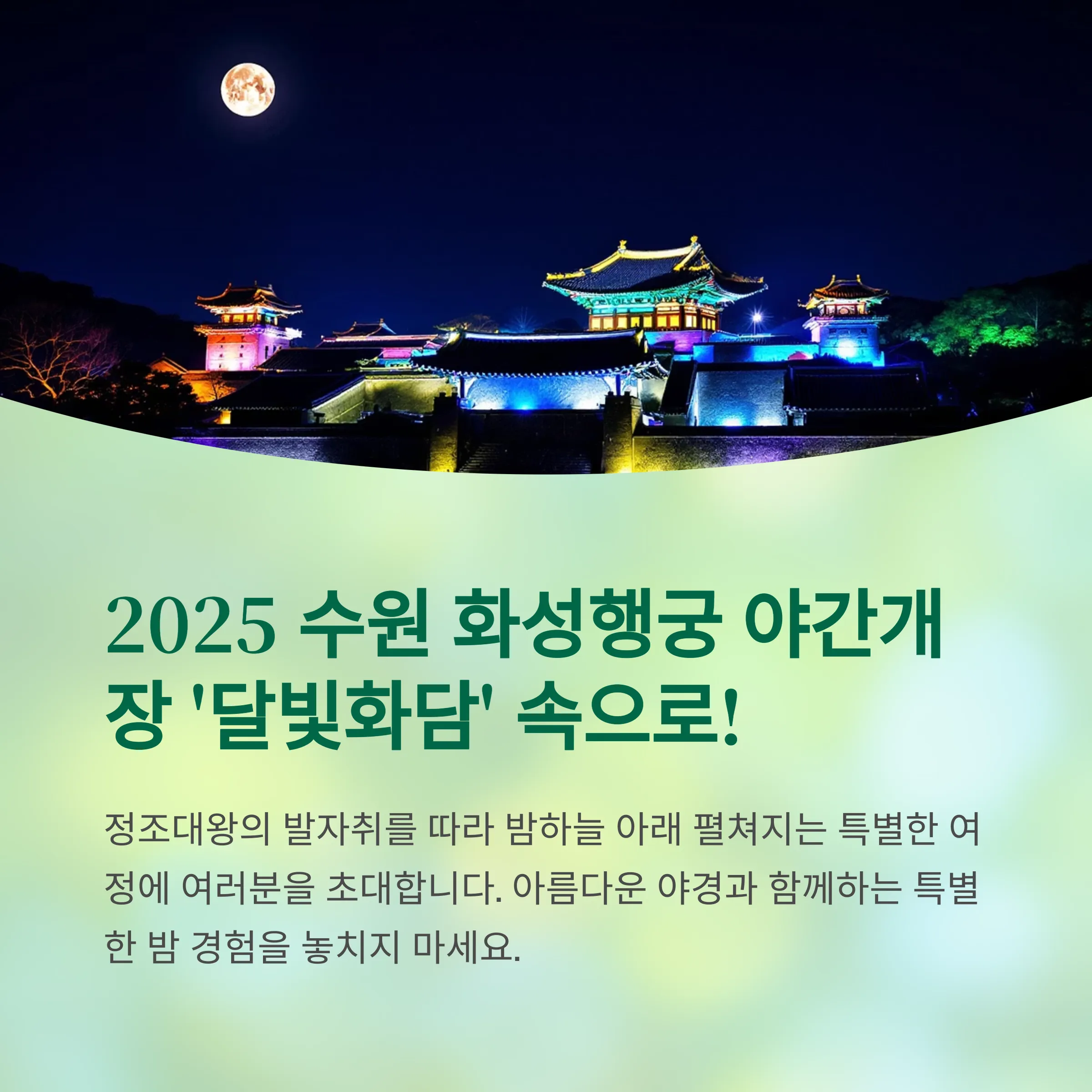 달빛 화담과 미디어아트 같은 야간 개장 프로그램은 잊지 못할 여행의 특별한 순간을 선사합니다.