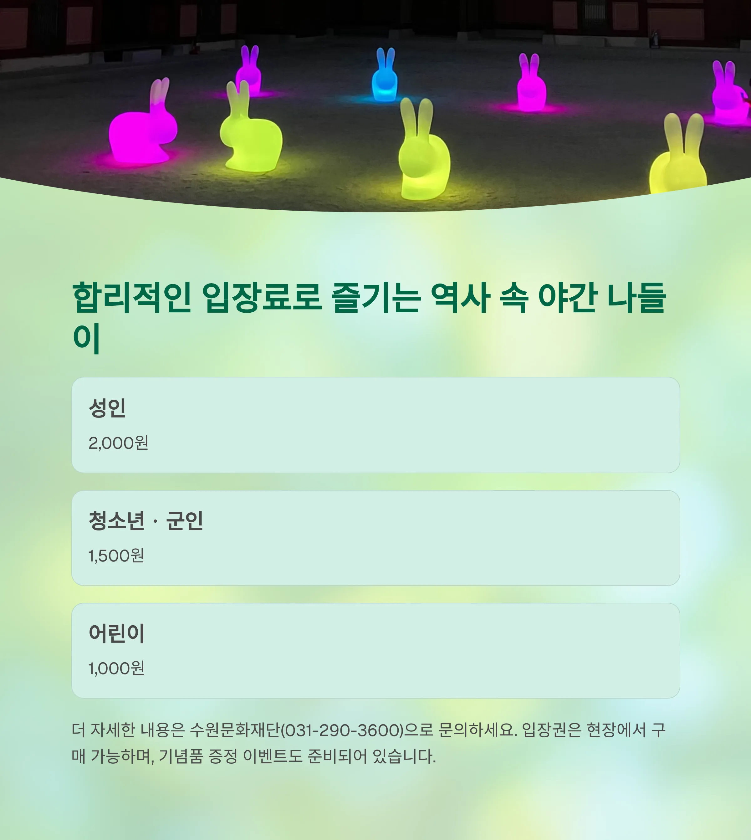 | 화성행궁 입장료 | 성인 2,000원/청소년 1,500원/어린이 1,000원 |