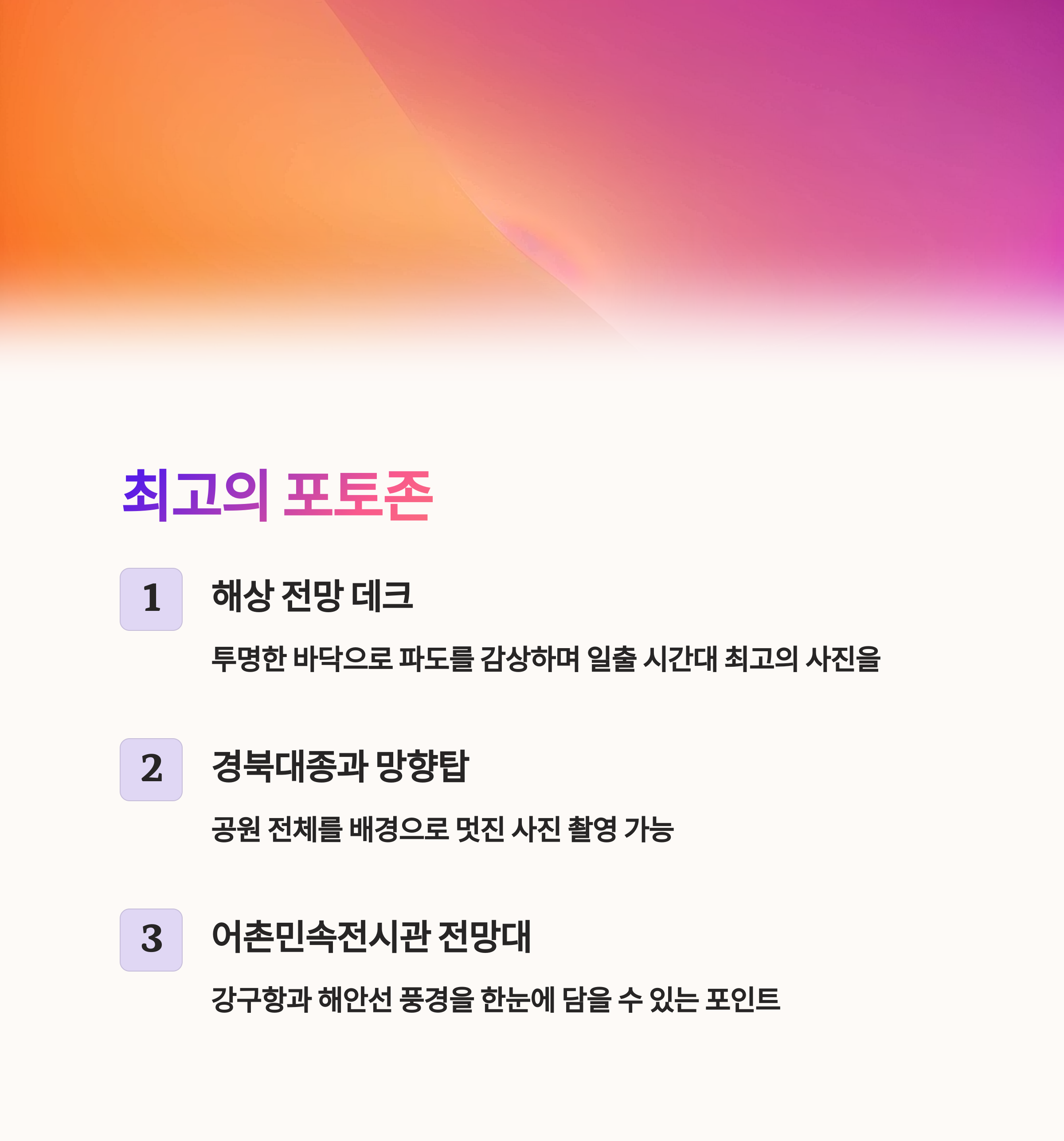 | 삼사해상공원의 인기 포토존 중 하나는 강화유리로 설계된 해상 전망 데크입니다. 이곳에서는 동해 바다를 가까이서 감상하며, 투명한 바닥으로 아래쪽 파도 모습을 볼 수 있습니다. 특히 일출 시간대에는 데크 위의 하늘과 바다가 어우러져 그림 같은 풍경을 선사합니다. 또 하나의 추천 장소로는 경북대종과 망향탑 주변입니다. 이곳에서는 공원 전체를 배경으로 멋진 사진 촬영이 가능합니다. 마지막으로, 어촌민속전시관 전망대도 강구항과 해안선 풍경을 한눈에 담을 수 있는 포인트로 손꼽힙니다. |