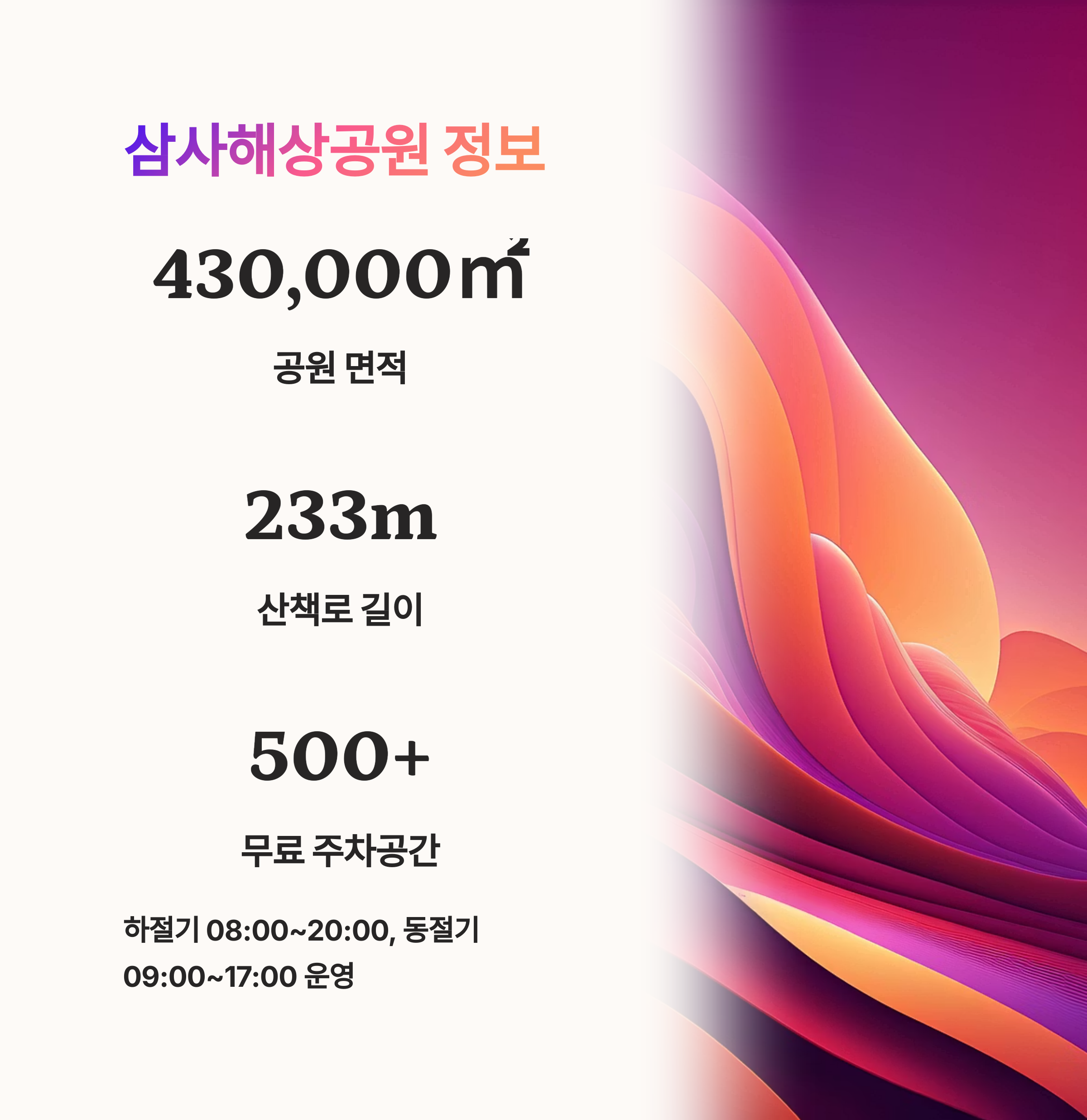 방문 전 운영시간과 날씨를 꼭 확인하고, 여유로운 마음으로 천혜의 경관을 즐겨 보세요.