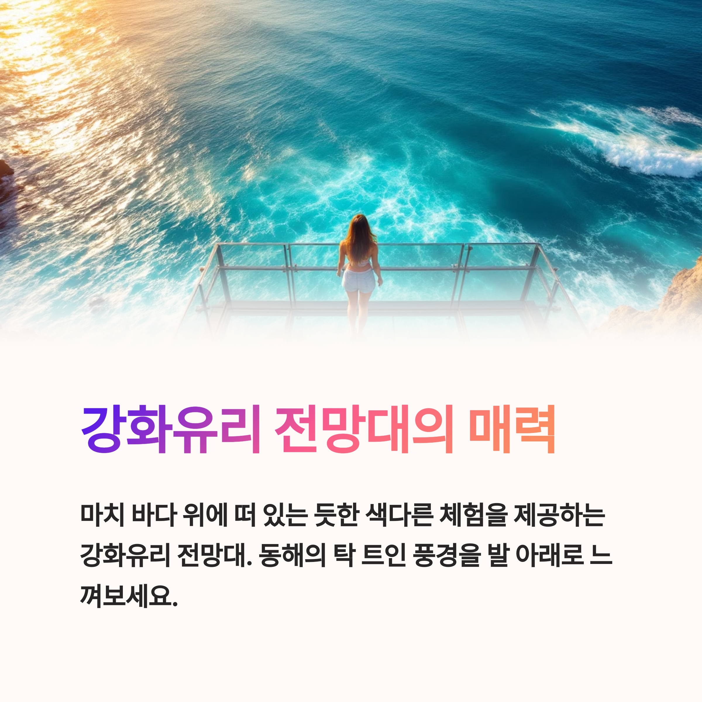 특히 산책길 주변으로 시선을 사로잡는 강화유리 전망대가 설치되어 있어, 마치 바다 위에 떠 있는 듯한 색다른 체험을 제공합니다.