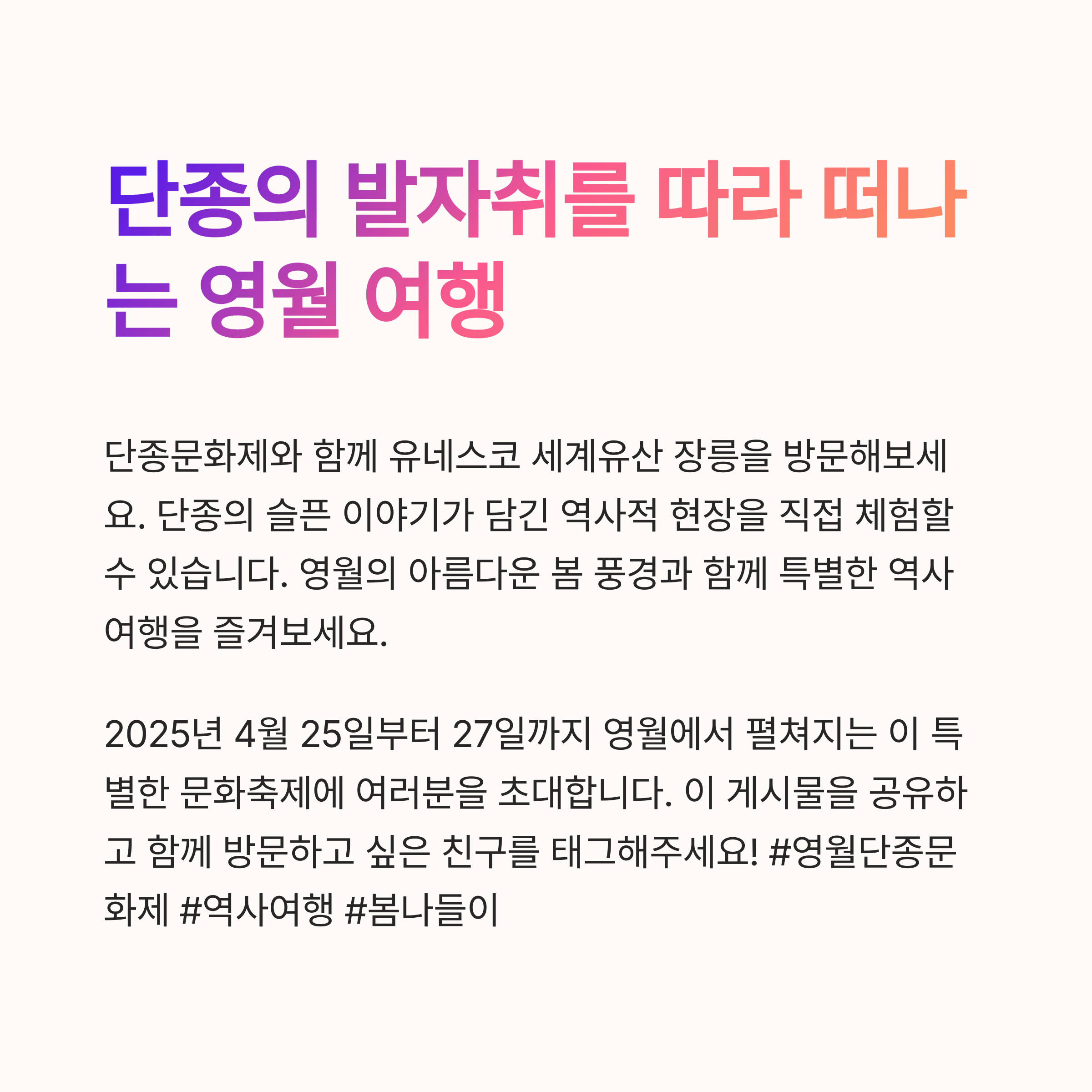 이번 단종문화제는 가족, 친구, 연인과의 여행에 최적화된 행사로 방문객들에게 깊은 인상을 남길 것입니다.