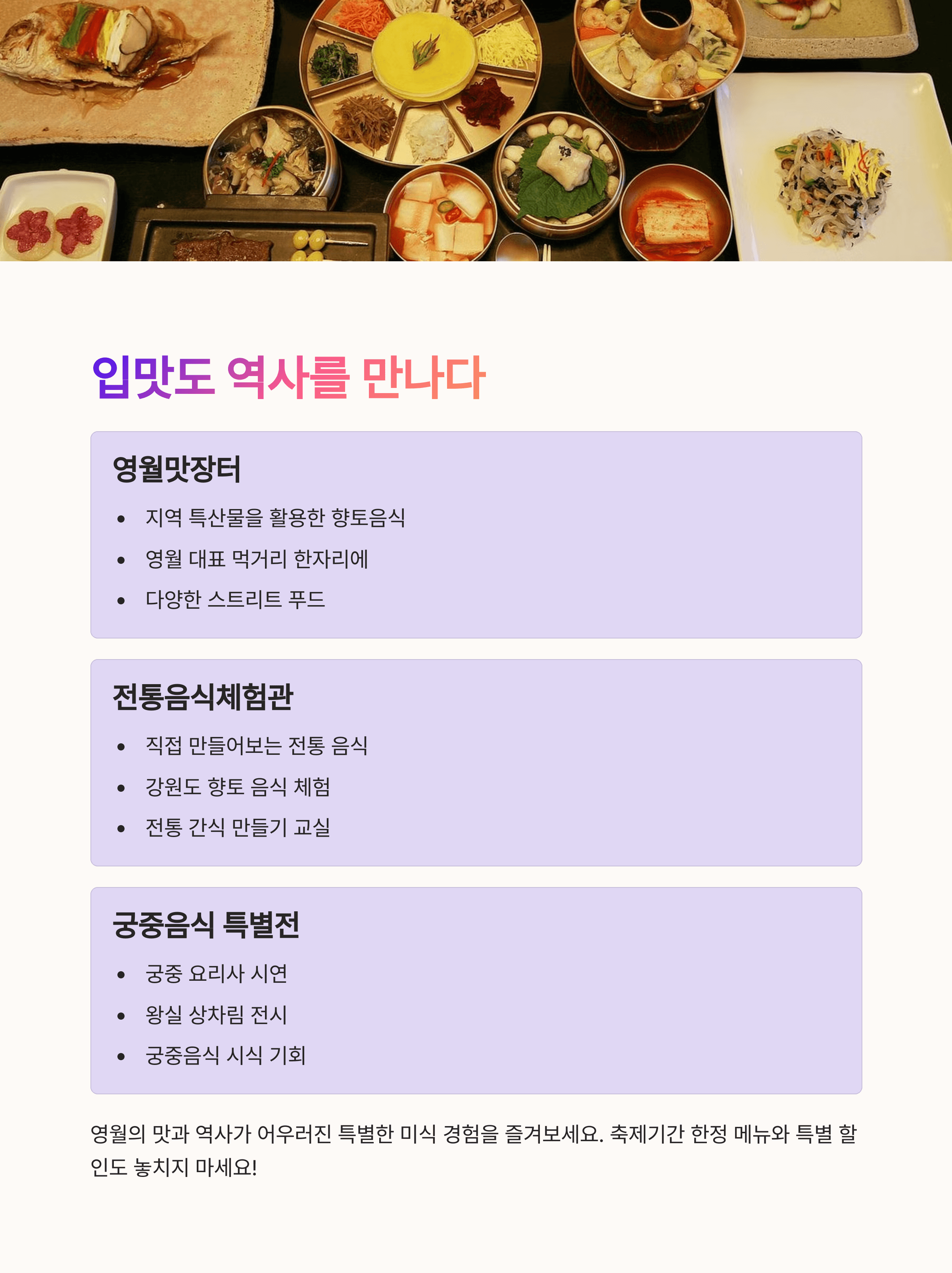 | 영월은 맛있는 지역 특산물과 전통음식으로 유명합니다. 감자전과 강원도식 막국수는 대표적인 지역 명물 음식입니다. 영월맛장터에서는 지역 주민이 직접 만든 신선한 농산물과 음식을 맛볼 수 있습니다. 축제 현장에서는 전통 간식 체험 코너도 운영되고 있습니다. 특히 단종문화제 기간에는 특별한 궁중음식 체험을 즐길 수 있습니다. |