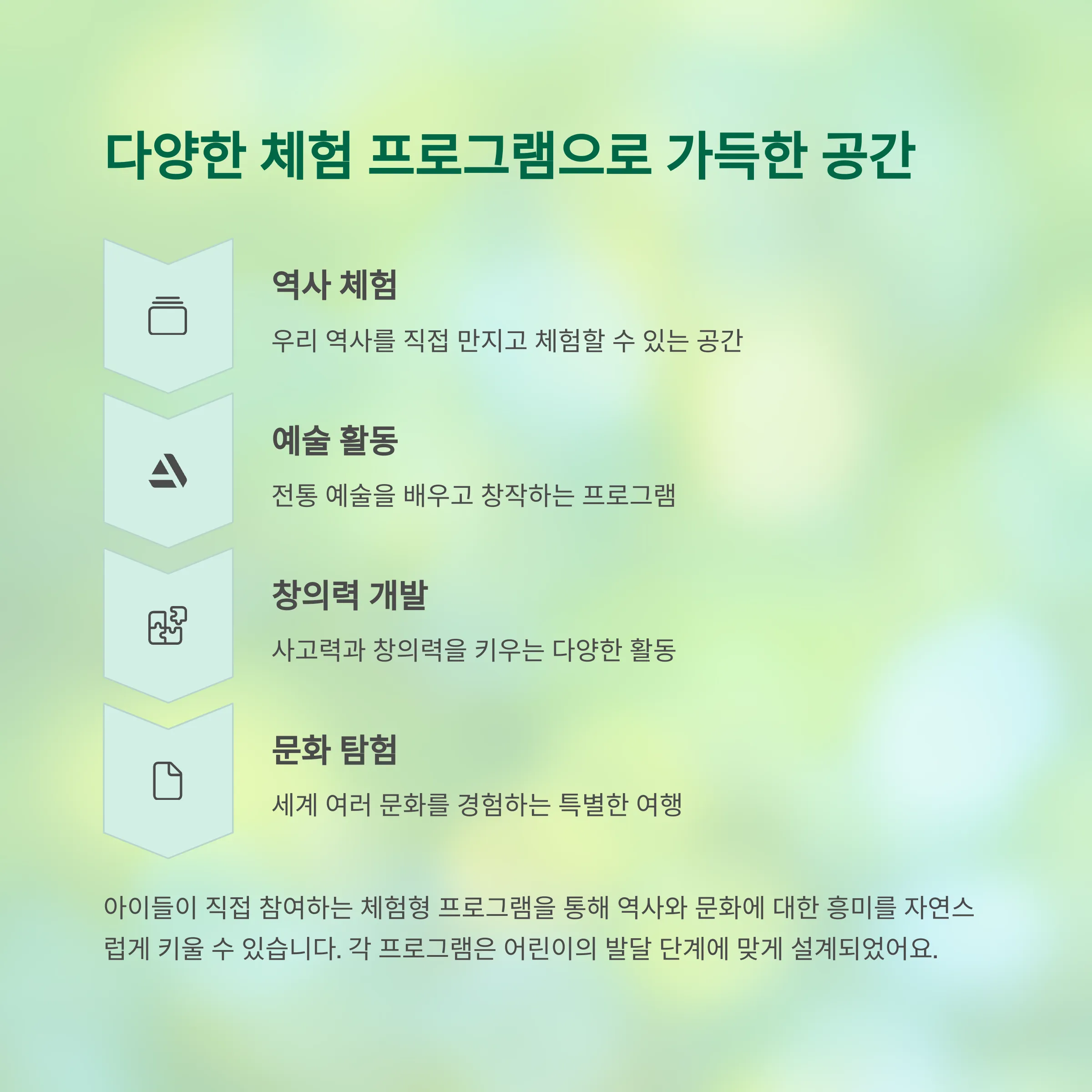 이곳은 어린이들에게 학습, 놀이 경험을 동시에 제공하며 부모님들과의 의미 있는 시간을 만들어줍니다.