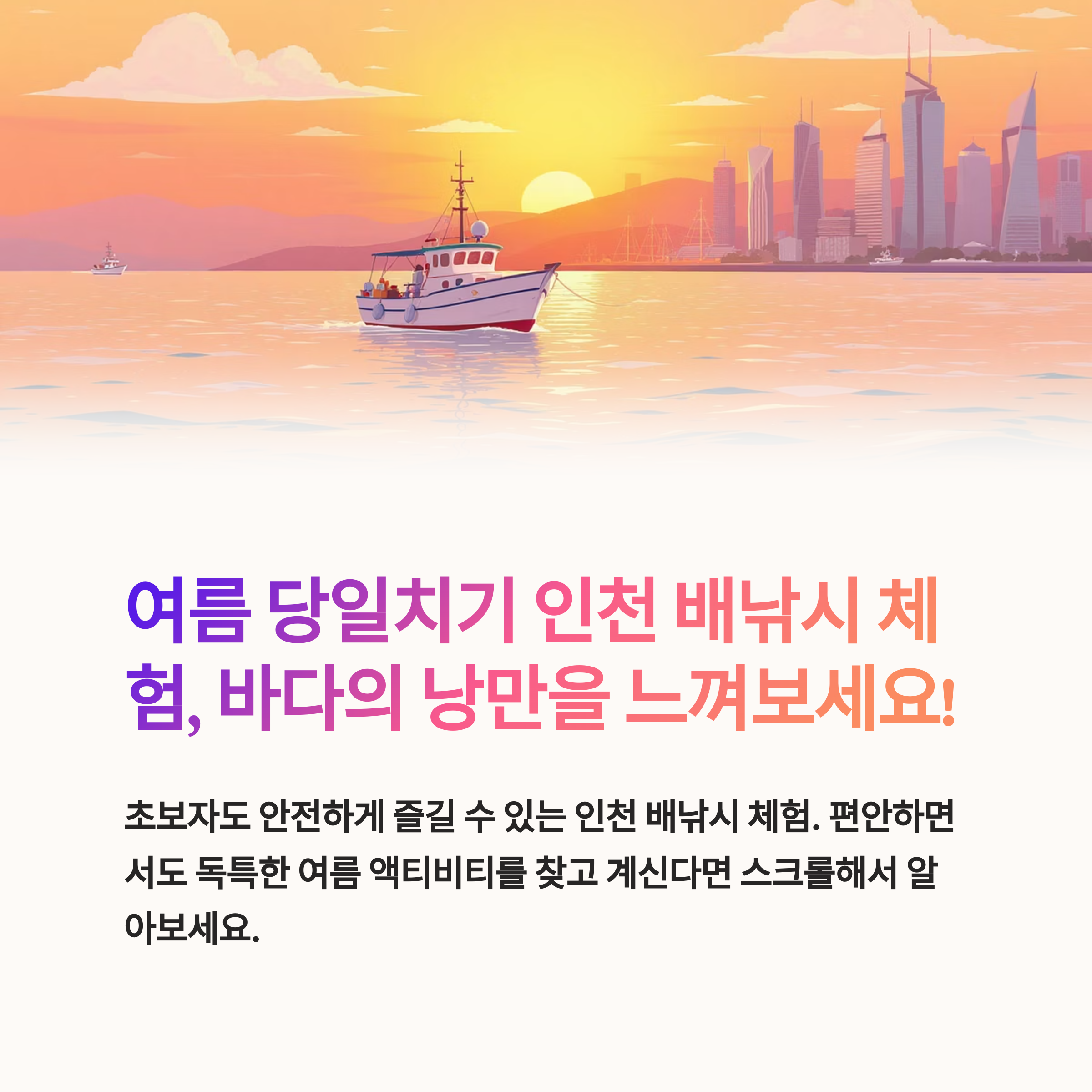 인천 배낚시 체험은 5월~여름 시즌에 가장 활발히 이루어지고 있으며, 연령, 숙련도에 상관없이 즐길 수 있는 활동으로 인기를 끌고 있습니다.