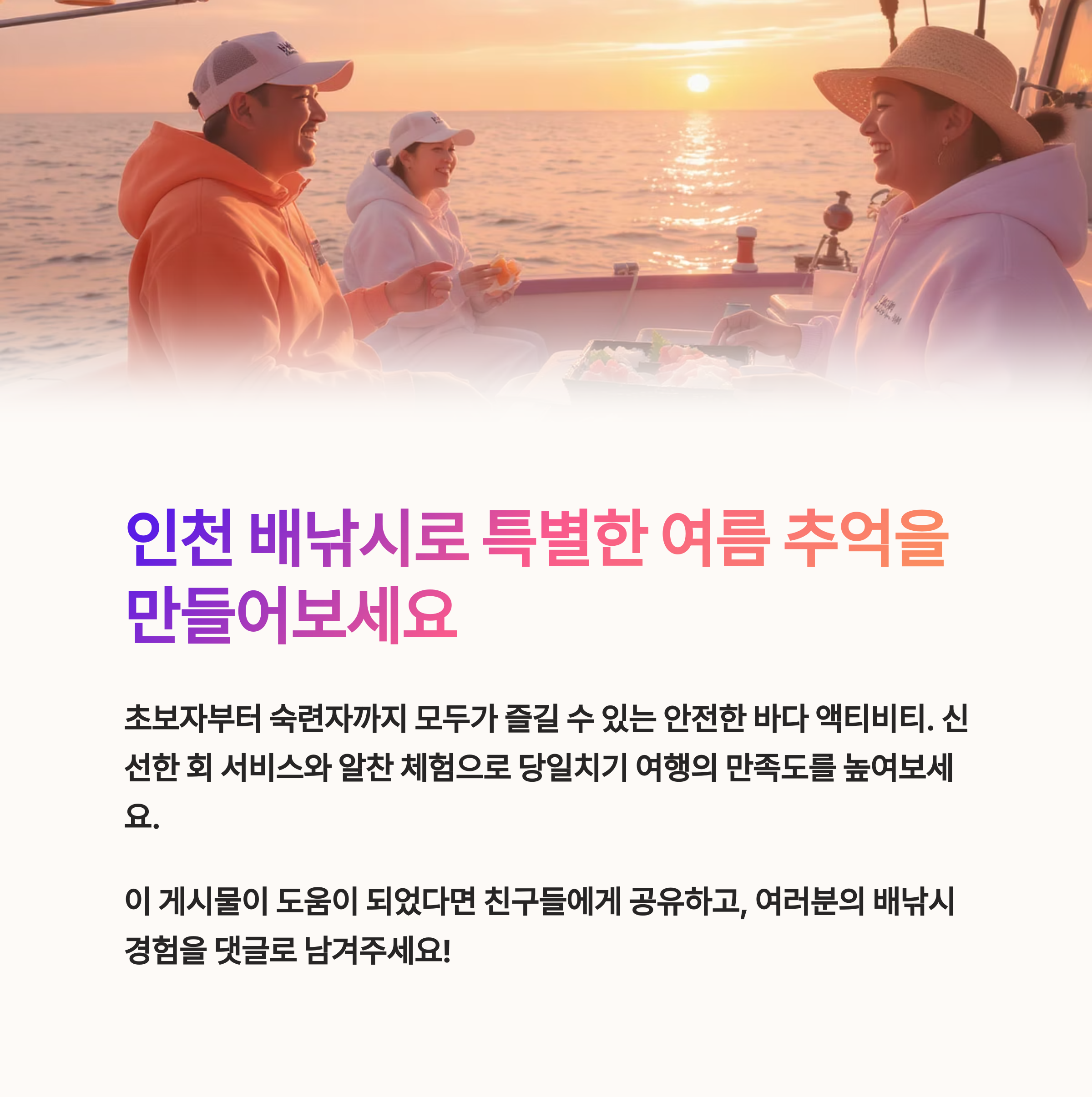 따라서 여름 당일치기 여행지로, 체험형 바다 액티비티를 고민하신다면 인천 배낚시를 강력히 추천드립니다.