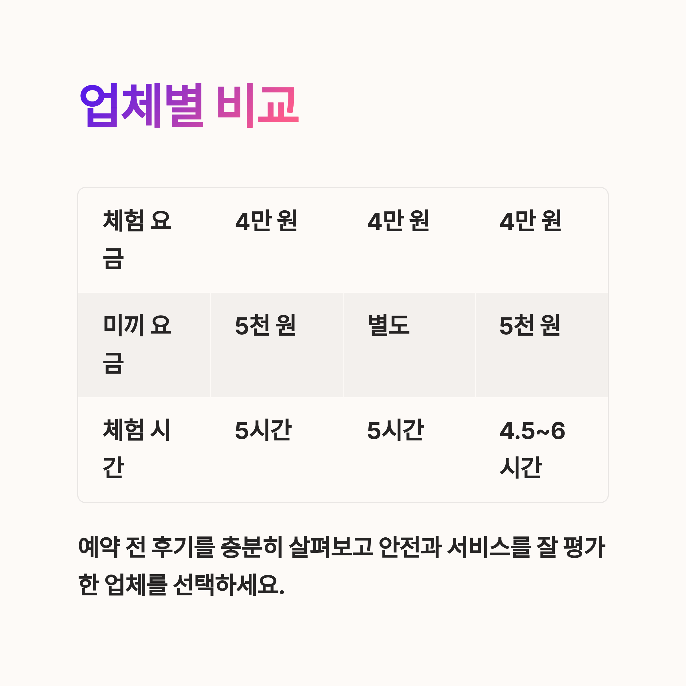 - 체험 요금은 평균 4~6만 원으로 합리적입니다.