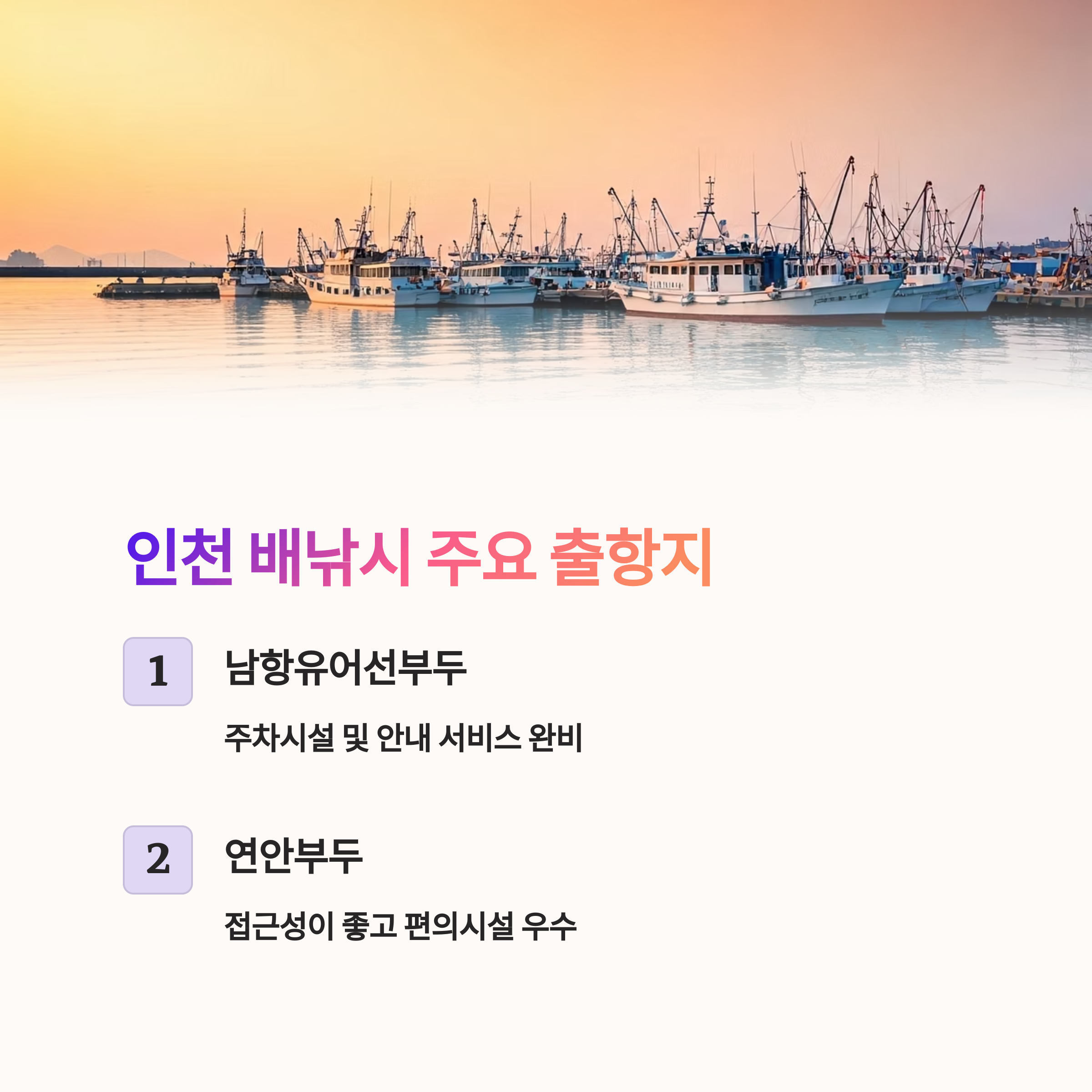 - 주요 출항지의 접근성과 편의성도 매우 우수합니다.