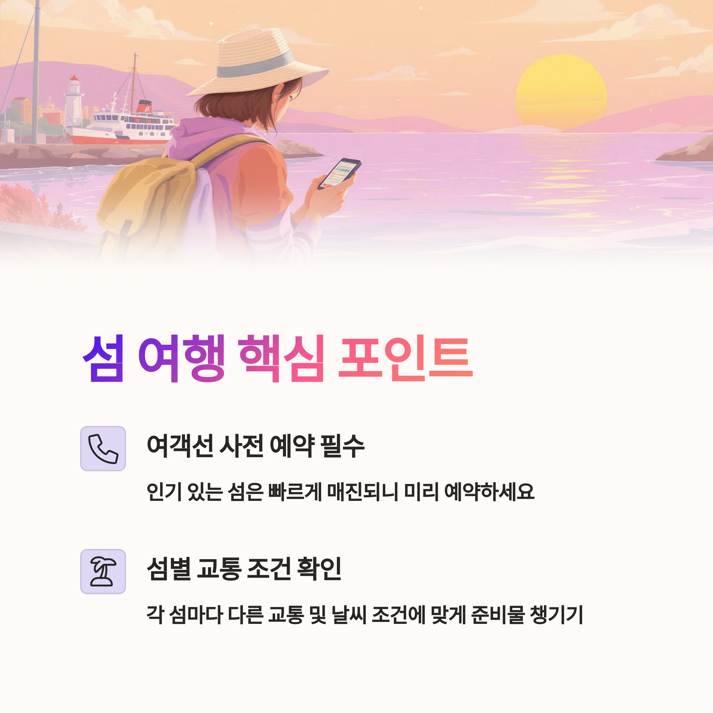 각 섬마다 다른 교통 및 날씨 조건을 확인하여 준비물을 꼼꼼히 챙겨주세요.
