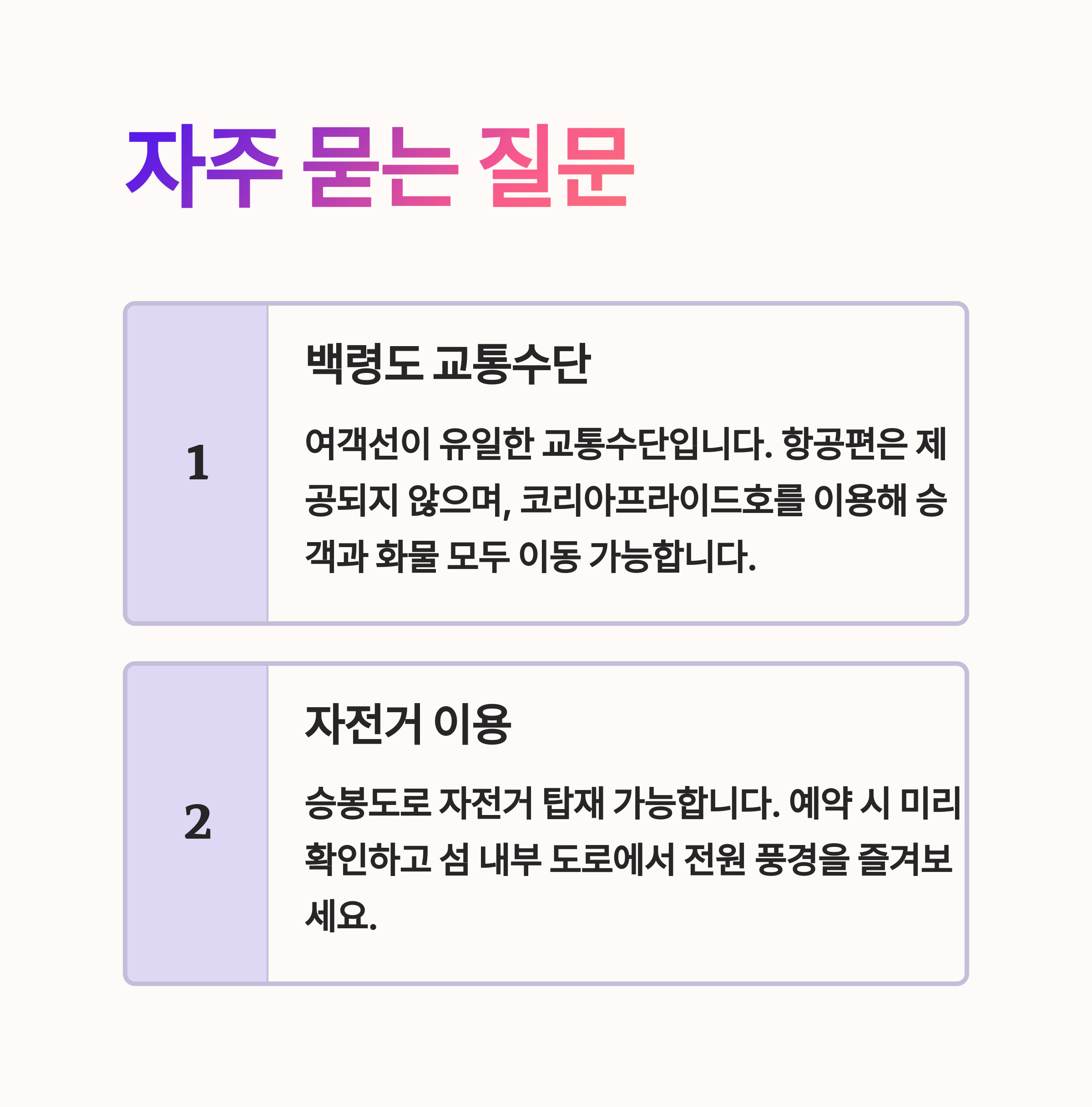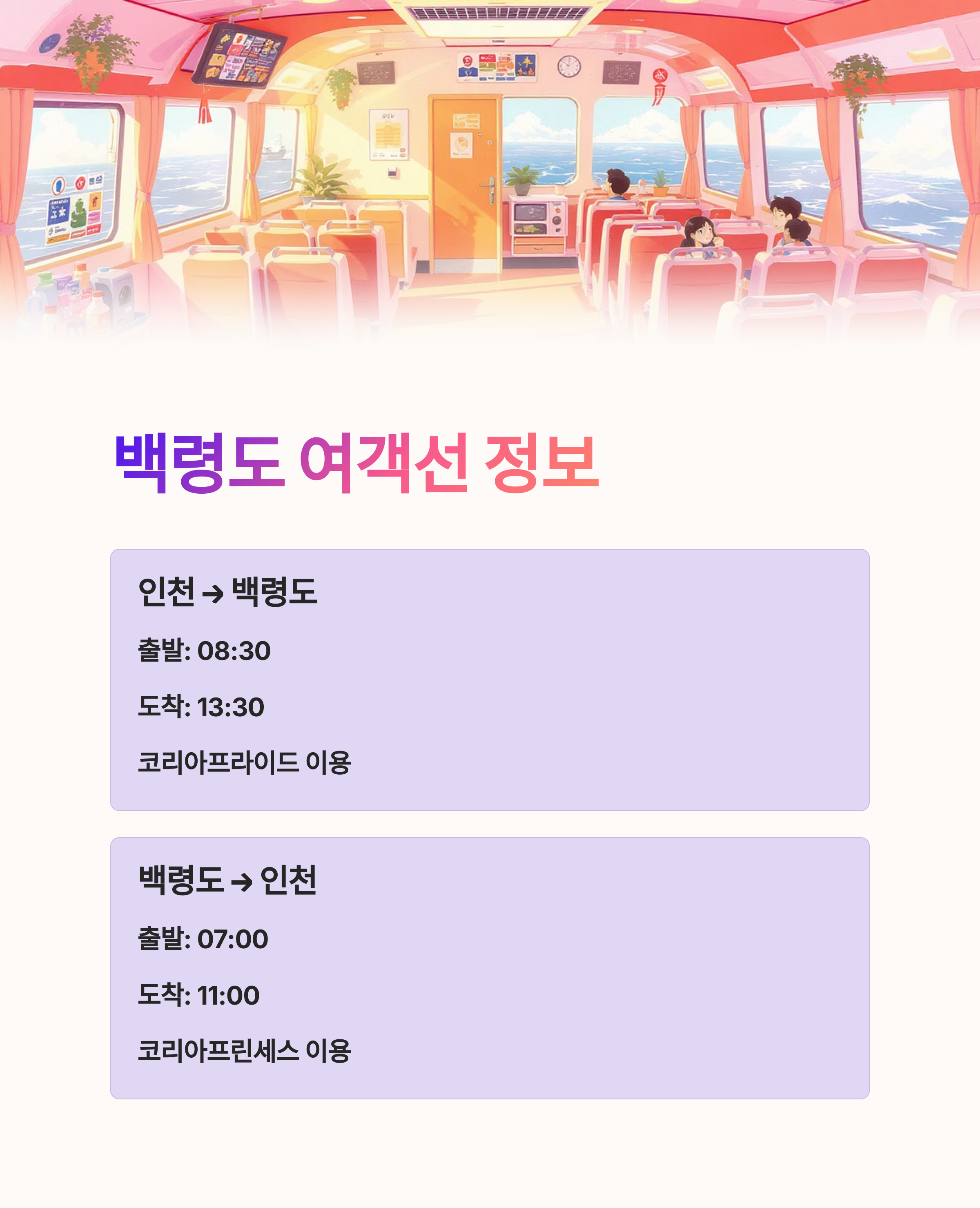 | 인천 → 백령도 | 08:30 | 13:30 | 코리아프라이드 이용 |