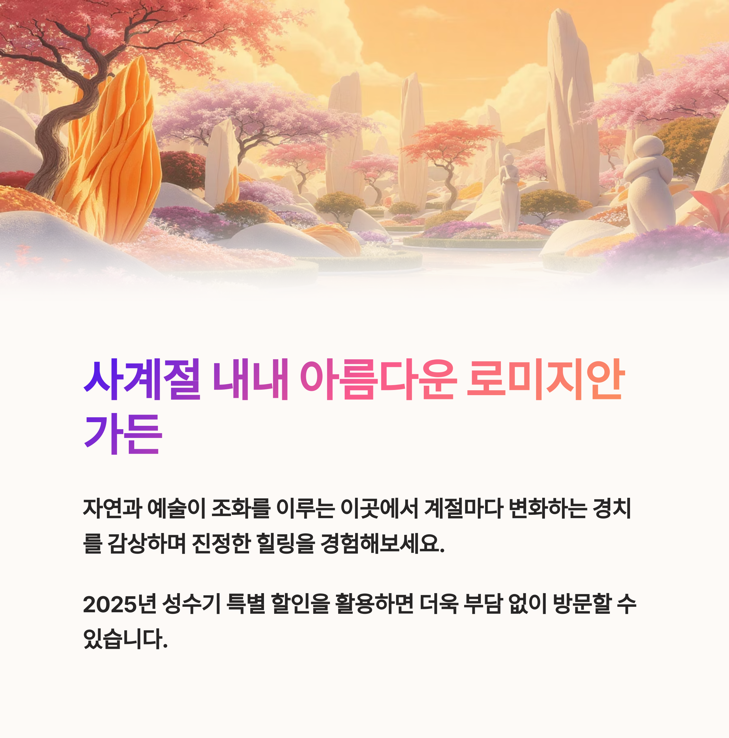여유롭고 편안한 시간이 필요하다면 로미지안 가든을 찾아 자연의 품에 안겨보세요.