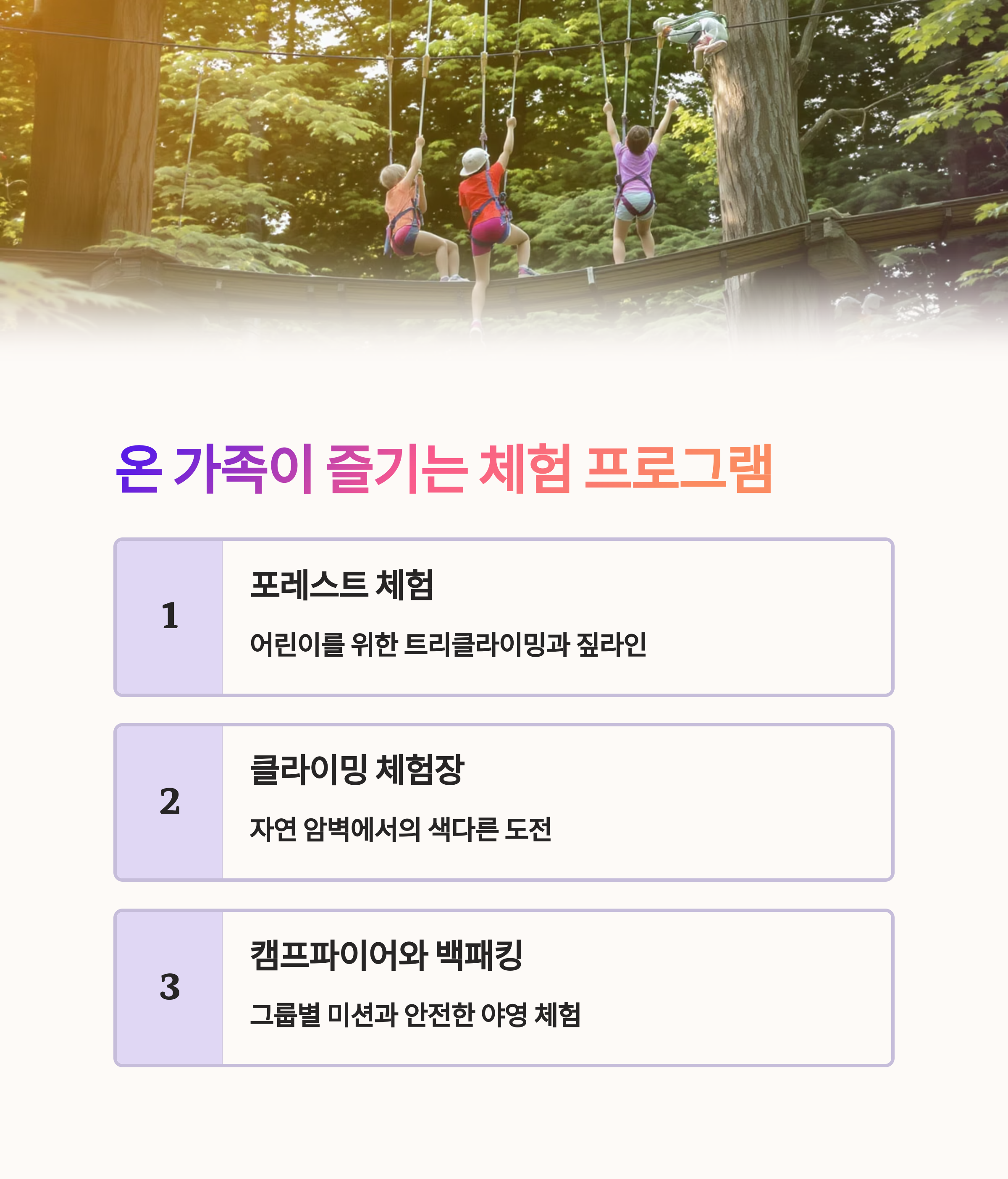 1. 포레스트 체험 프로그램: 어린이를 위한 트리클라이밍과 짚라인.