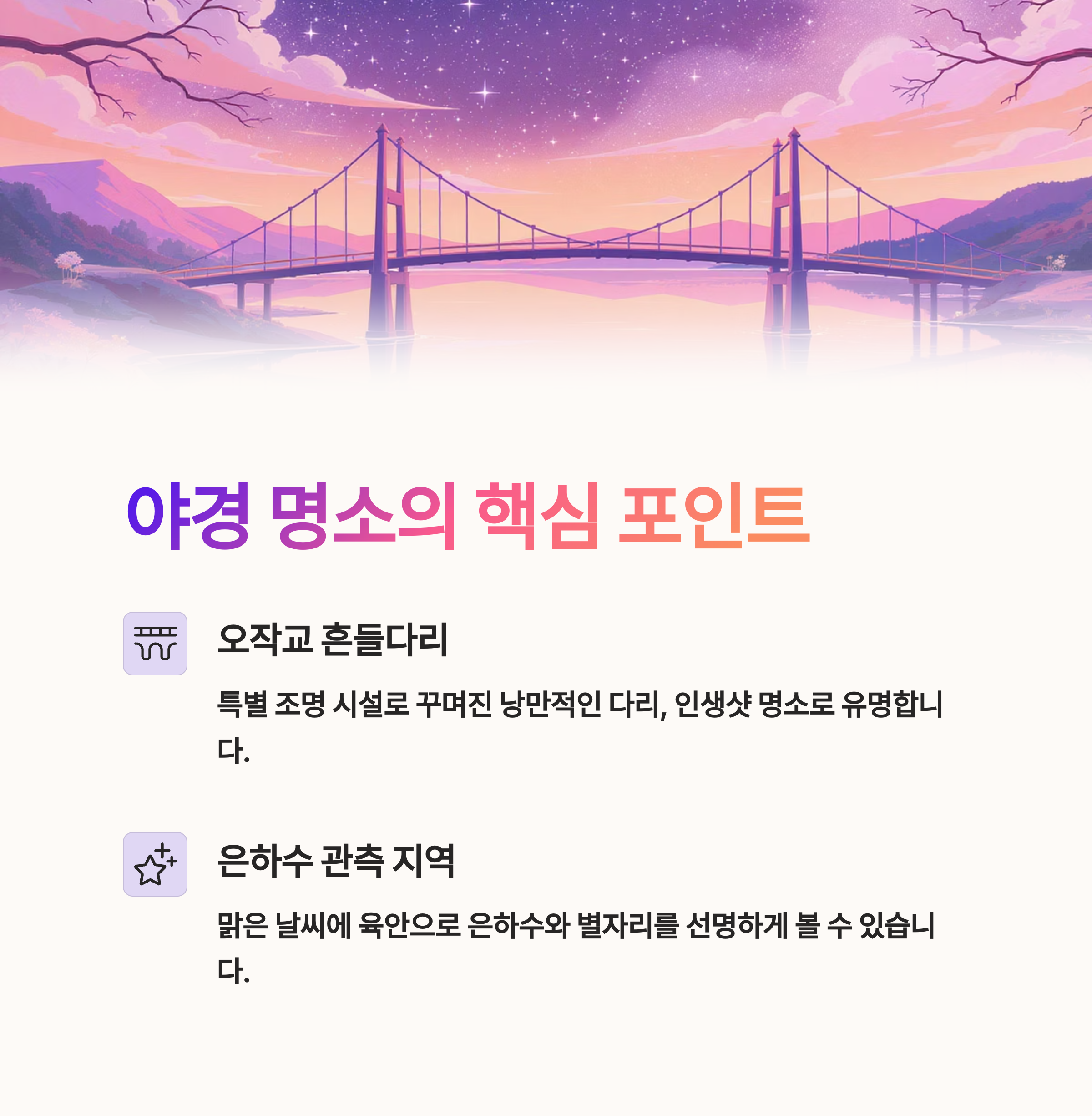 | 주요 야경 포인트 | 오작교 흔들다리, 별 관측 지역 |
