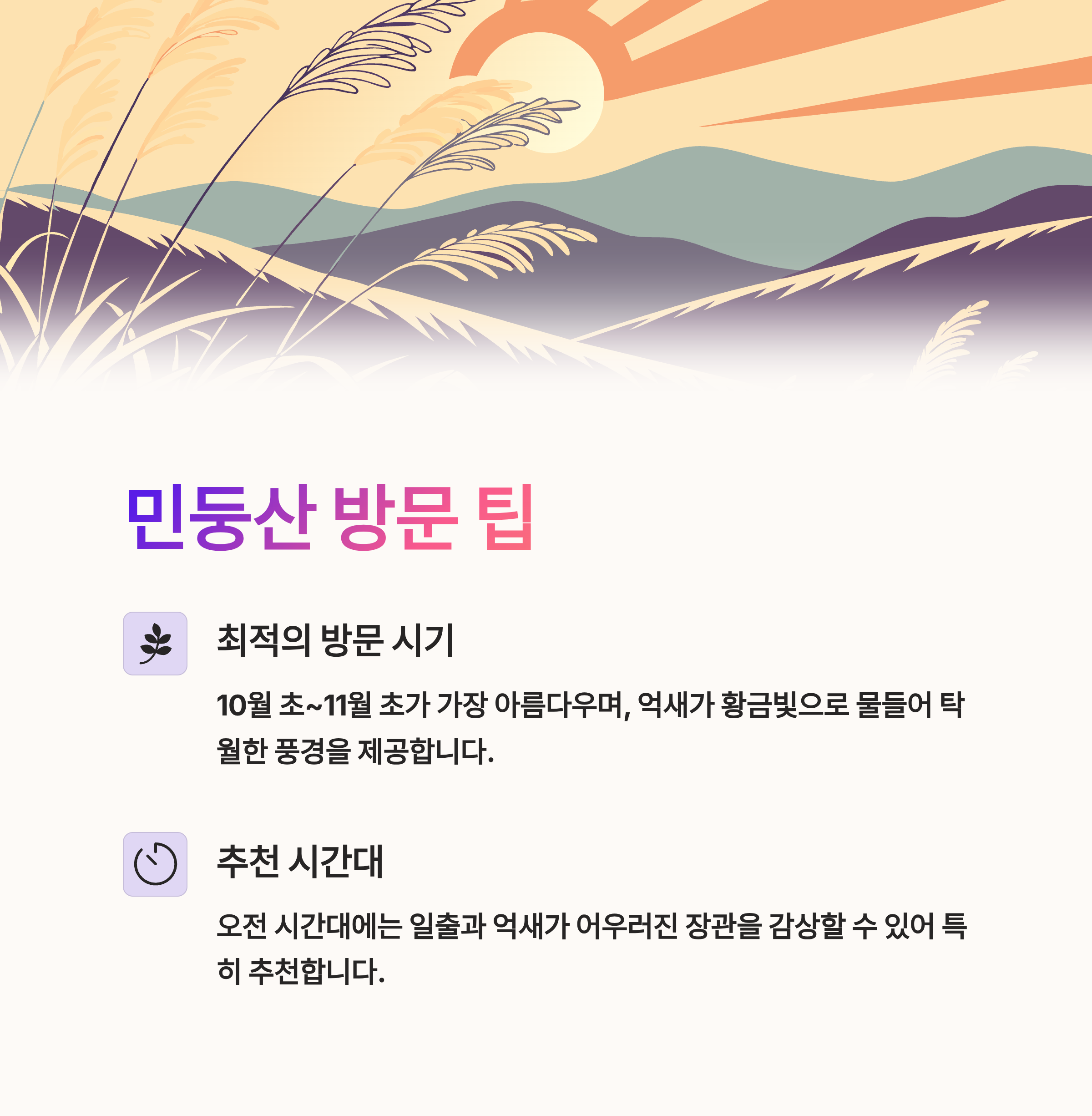 | 민둥산 억새 군락지는 가을철(10월 초~11월 초)이 가장 아름답습니다. 특히 이 시기에는 억새가 햇빛을 받아 황금빛으로 물들며 탁월한 풍경을 제공합니다. 고도가 높지 않고 등산 코스도 완만해 가족 단위 여행객에게 추천됩니다. 오전 시간대에는 일출과 억새가 어우러진 장관을 감상할 수 있습니다. 날씨가 건조해지는 늦가을에는 억새가 흔들리는 소리를 들으며 자연의 고요함을 즐기기에 좋습니다. |