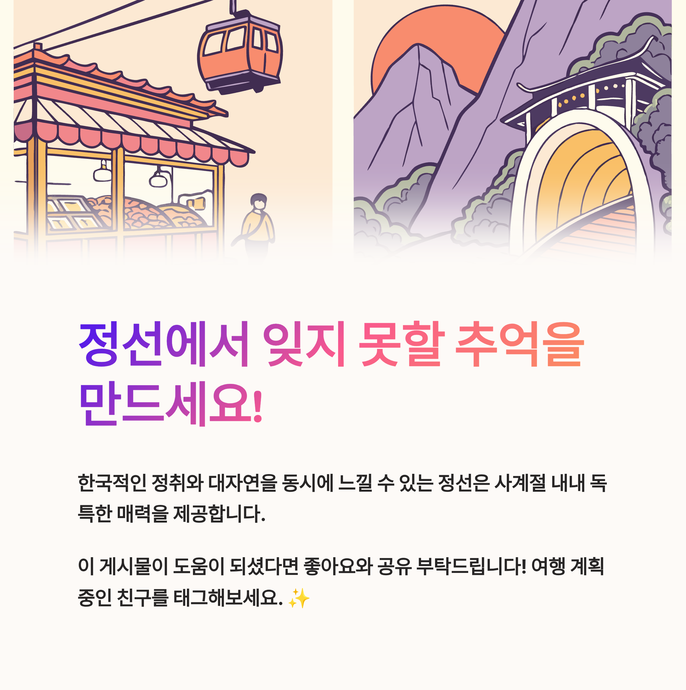 정선은 한국적인 정취와 대자연을 동시에 느낄 수 있는 여행지입니다.